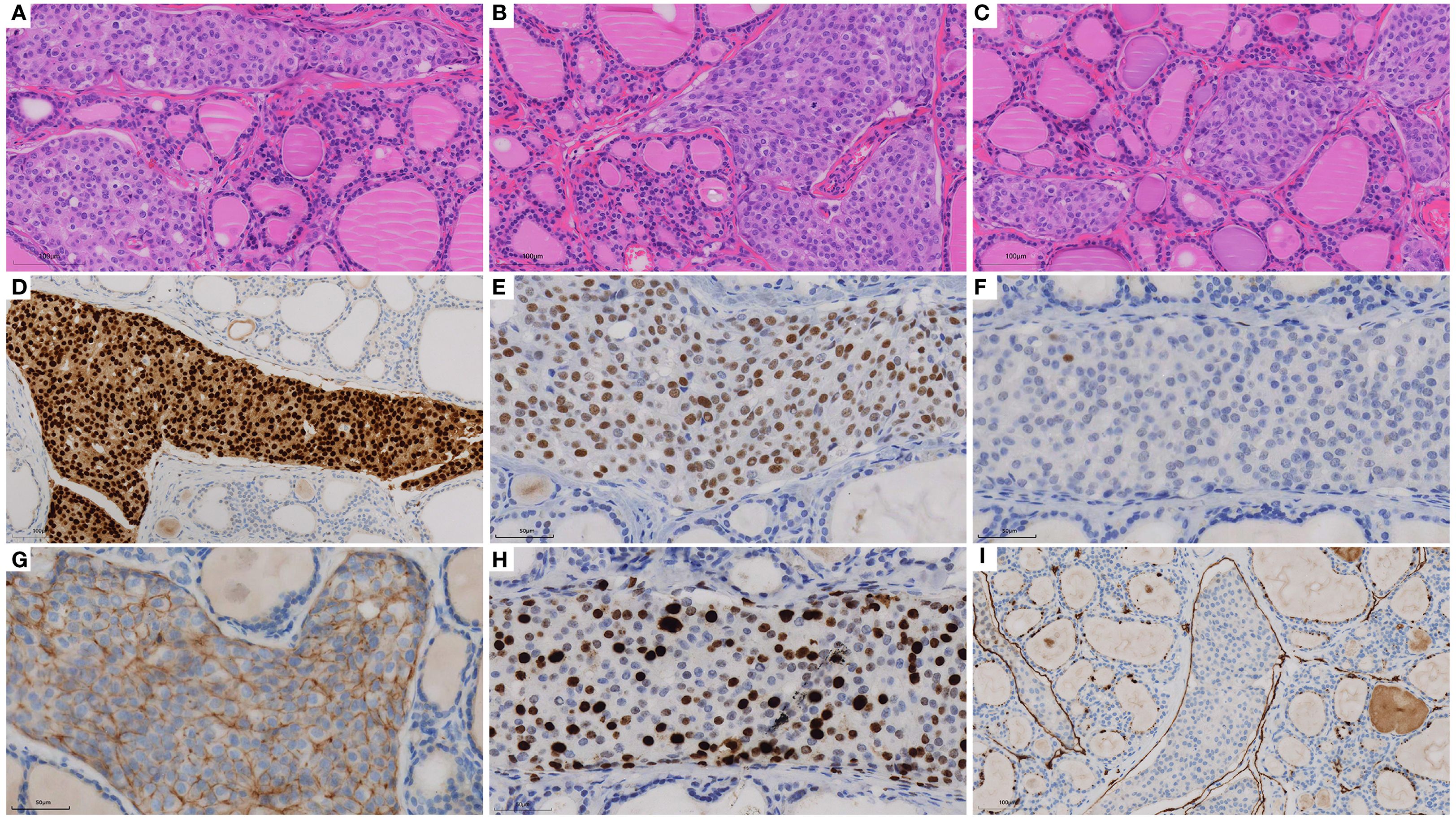Figure 2. H&E staining and immunohistochemistry of biopsy specimens: (A-C) H&E of thyroid (×20), (D) GATA3 (×20), (E) ER (×40), (F) PR (×40), (G) HER2 (×40), (H) Ki-67 (×40) and (I) D2-40 (×20).