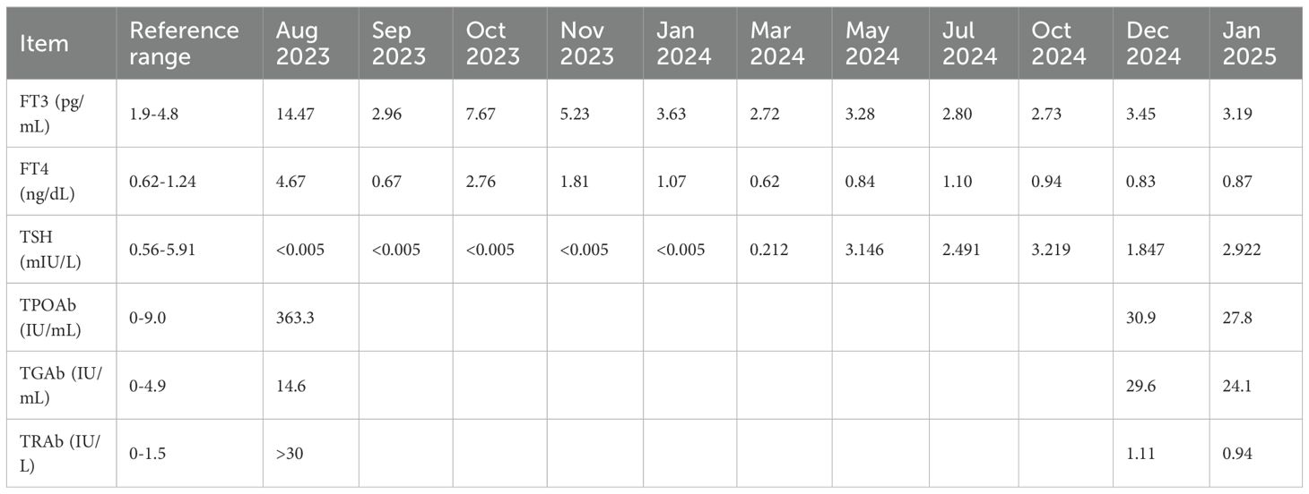 The patient was followed regularly according to the planned surveillance schedule, with no evidence of recurrence or distant metastasis. In January 2020, thyroid ultrasonography revealed a 4×3 mm solid hypoechoic nodule in the inferior pole of the right thyroid lobe. Given the small size of the lesion, biopsy was not performed and the patient was advised to continue routine follow-up. Subsequent evaluations demonstrated no significant changes in the size or characteristics of the nodule. In August 2023, the patient reported symptoms of neck swelling, hand tremors, exophthalmos, and weight loss. Thyroid ultrasonography at that time showed diffuse enlargement of the thyroid gland with increased vascularity. Hyperthyroidism was confirmed by thyroid function tests (Table 1). The patient was diagnosed with Graves’ disease. The endocrinologist recommended the treatment with methimazole, which resulted in stabilization and normalization of thyroid function (Table 1).