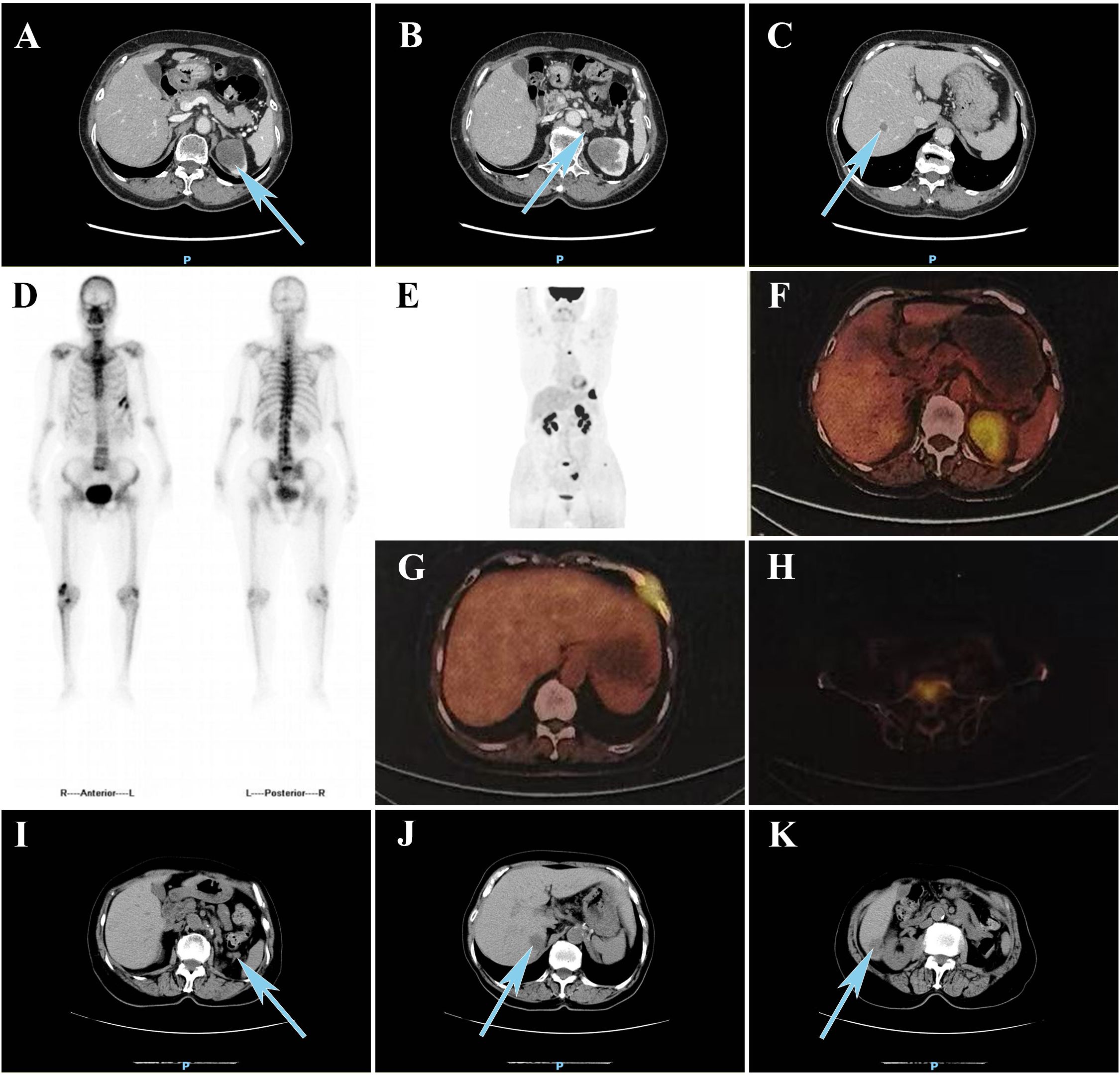Figure 1. (A) Contrast-enhanced CT reveals (A) a heterogeneously enhancing mass at the left renal upper pole, (B) progressive retroperitoneal lymphadenopathy, and (C) hypodense lesions in the liver. (D) 99mTc-MDP bone scintigraphy demonstrated increased tracer uptake in the left sixth and seventh anterior ribs, sacrum, and left sacroiliac joint. (E) MIP reconstruction of 18F-FDG PET/CT. 18F-FDG PET/CT demonstrated increased fluorodeoxyglucose uptake in (F) the upper pole of the left renal upper pole, (G) left sixth and seventh ribs, and (H) L3 vertebral body. Follow-up CT at 3 months demonstrated newly (I) enlarged retroperitoneal lymph nodes and (J, K) two hypoattenuating hepatic lesions. CT, computed tomography; 99mTc-MDP, technetium-99m methylene diphosphonate; MIP, maximum intensity projection; 18F-FDG, fluorine-18 fluorodeoxyglucose; PET, positron emission tomography.