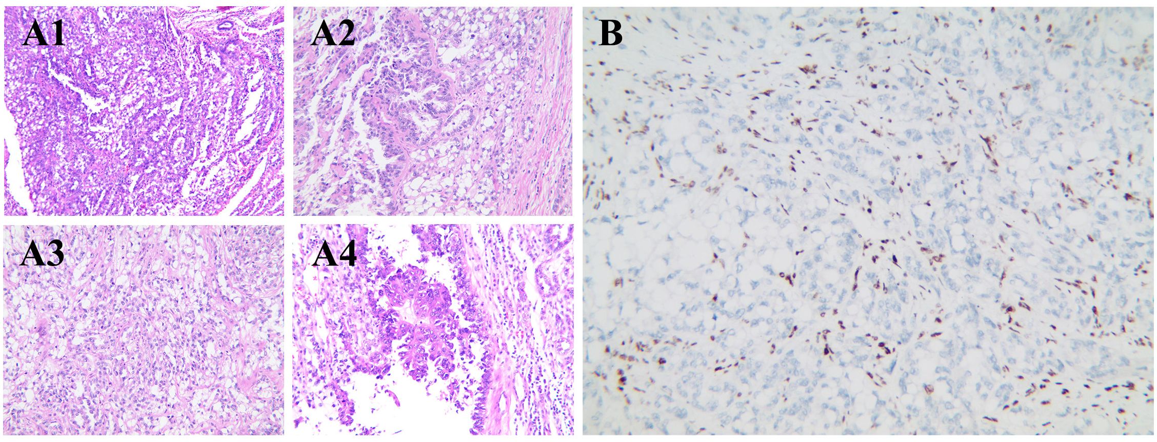 Figure 2. Histologic and immunohistochemical features of SMARCA4-dRCC. (A1) Low-power field with tumor cells showing clear to eosinophilic cytoplasm, arranged in solid and focal tubular patterns, with infiltrative borders. (A2) High-power field with prominent nucleoli, marked nuclear atypia, and architectural disarray. (A3) Sarcomatoid differentiation with spindle-shaped tumor cells in disorganized fascicles. (A4) Rhabdomyoblastic differentiation with eosinophilic cytoplasm and eccentric nuclei. (B) Immunohistochemistry showing complete loss of SMARCA4/BRG1 expression in tumor cells. RCC, renal cell carcinoma.