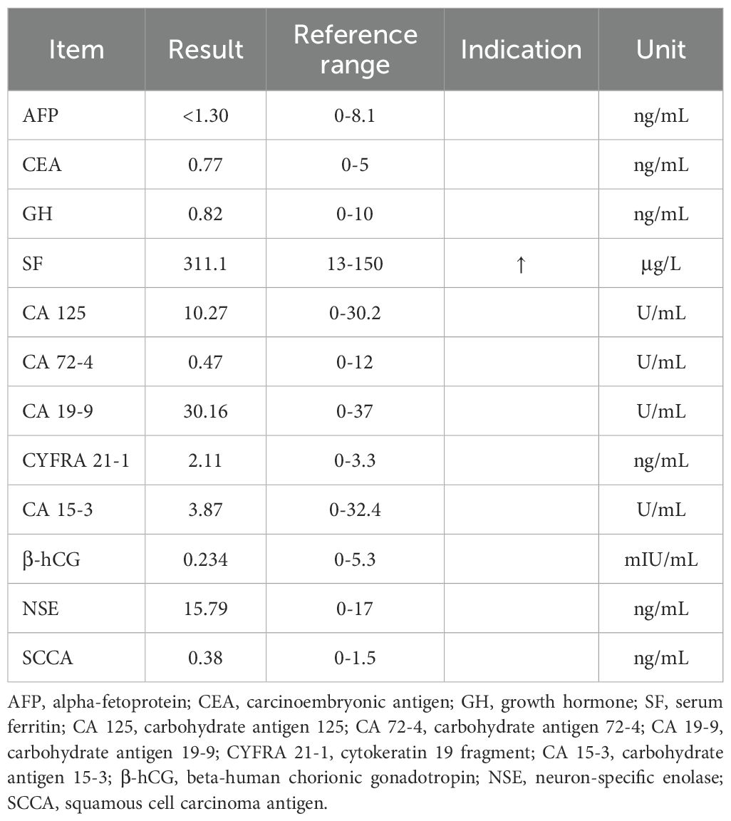 Laboratory tests showed elevated serum ferritin (311.1 µg/L; reference range: 13–150 µg/L), whereas other tumor biomarkers yielded no significant findings (Table 1). Contrast-enhanced abdominal computed tomography (CT) demonstrated a 40 × 36mm heterogeneously enhancing mass at the left renal upper pole, with mild and persistent enhancement accompanied by retroperitoneal lymphadenopathy and subcentimeter hypodense hepatic nodule (Figures 1A–C). Technetium-99m methylene diphosphonate (99mTc-MDP) whole-body scintigraphy revealed focally augmented tracer accumulation at left sixth/seventh anterior ribs, sacral alae, and left sacroiliac joint (Figure 1D). Subsequent standard Fluorine-18 fluorodeoxyglucose positron emission tomography/computed tomography (18F-FDG PET/CT) delineated a hypermetabolic exophytic renal mass (maximum standardized uptake value [SUVmax] of 7.4) in continuity with the left renal upper pole cortex, accompanied by enlarged retroperitoneal lymph nodes and multiple small hypoattenuating hepatic lesions demonstrating FDG avidity (Figure 1F). Osseous metastases were identified in the left sixth and seventh anterior ribs, L3 vertebral body, sacrum, left iliac bone, and left femur, showing metabolically active foci (SUVmax 8.5) with CT evidence of variable bone destruction (Figures 1G, H).