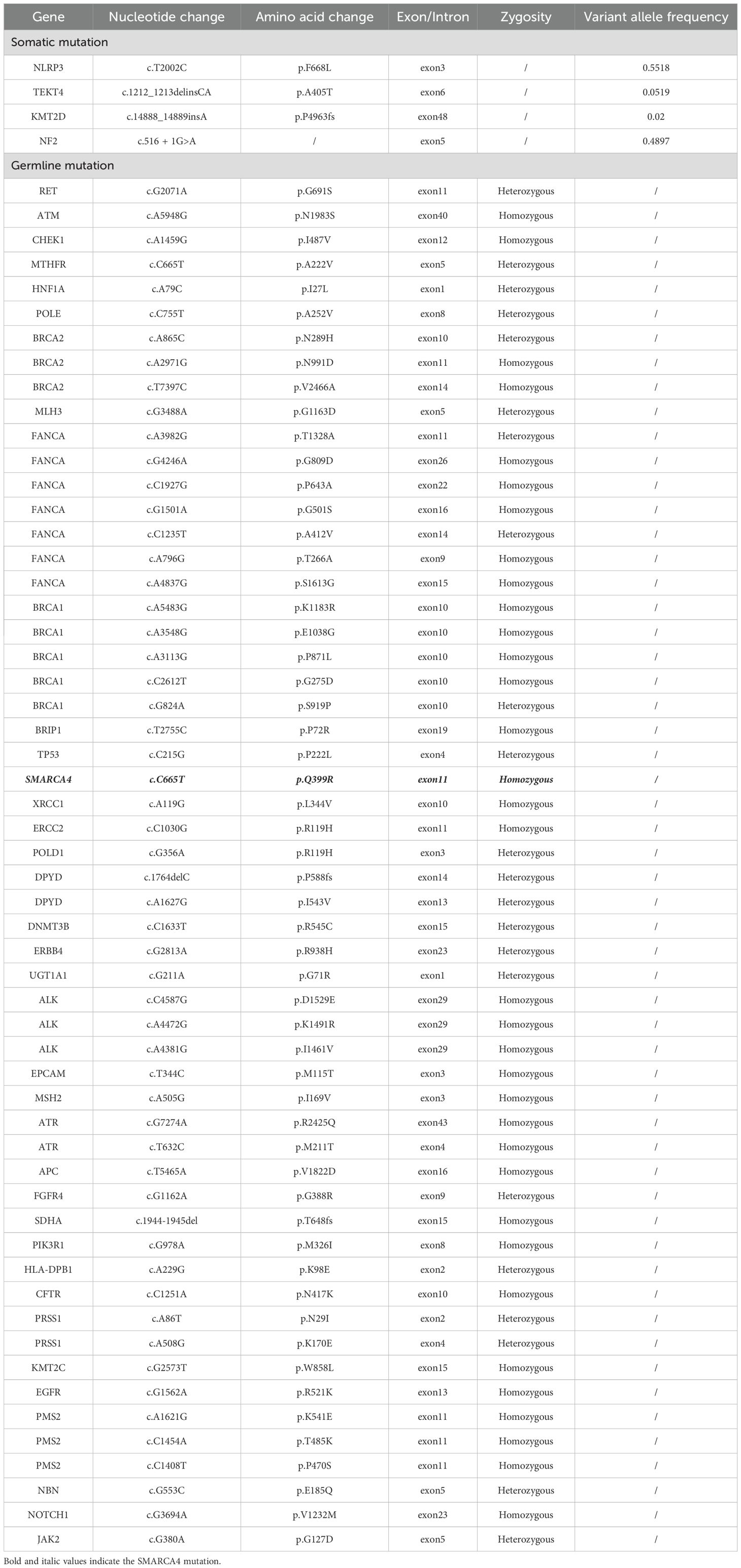 It is worth noting that we identified a heterozygous germline mutation in SMARCA4 in this patient. Unlike sporadic tumors driven by somatic mutations, this germline alteration follows an autosomal dominant inheritance pattern with incomplete penetrance, indicating a potential hereditary predisposition to cancer (25, 26). This mechanism closely parallels that observed in small cell carcinoma of the ovary, hypercalcemic type (SCCOHT), wherein more than 40% of cases are driven by germline SMARCA4 mutations (27, 28). Thus, we propose that tumorigenesis in SMARCA4-deficient RCC similarly adheres to Knudson’s classic two-hit model: an initial germline loss-of-function mutation serves as the first hit, followed by somatic inactivation of the remaining wild-type allele, leading to complete loss of BRG1 function (29). Given these implications, germline SMARCA4 testing and cascade screening of at-risk relatives are essential to enable tailored surveillance strategies, including periodic imaging and biochemical assessments for early tumor detection and improved clinical outcomes.