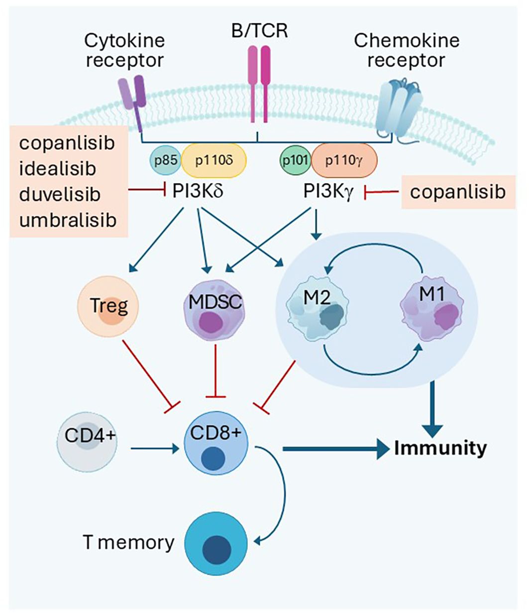 PI3Ks phosphorylate the inositol ring of phosphatidylinositol (PtdIns) lipids. Three classes are documented, and Class I is noted for its role in regulating cell signaling at and downstream of the plasma membrane. Class I PI3Ks consist of a regulatory subunit (p85) and a catalytic subunit (p110), which exists in four isoforms: α, β, γ, and δ. Whereas p110α and p110β are ubiquitously expressed in different tissues, p110γ and p110δ are mainly concentrated in leukocytes. Widespread high throughput sequencing discovered that p110α mutations were present in 14% of all solid tumors, strengthening the belief that targeting PI3Kα in solid tumors is sound (15). Initial successes in the clinics targeting PI3K in B cell malignancies using delta selective idelalisib ushered in an era of subtype targeting. The impact of different inhibitors on PI3Kδ and PI3Kα function is studied in BaF3 cells (16). It is noteworthy that Treg downregulation by PI3Kδ inhibitor emerged as an approach of TIME manipulation (Figure 1).