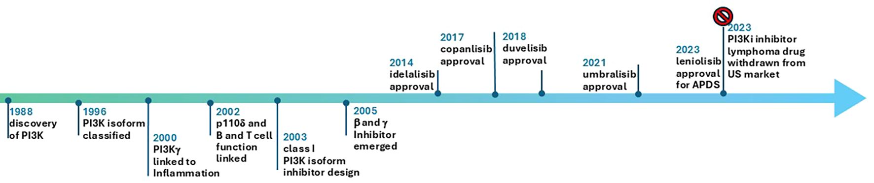 As of January 1, 2025, all FDA approved PI3Kδ inhibitor indications for lymphoma have been withdrawn in the US and ten trials for PI3Kδ are recruiting: Roginolisib in melanoma (NCT07203391, NCT06717126), myelofibrosis (NCT06887803), CLL(NCT06644183), R/R peripheral T cell lymphoma (NCT07018752) and non-small cell lung cancer (NCT06879717). HMPL-689 for relapsed or refractory (R/R) lymphoma (NCT05713110), and linperlisib in R/R peripheral T cell lymphoma (NCT06083701; NCT05949944) and R/R cutaneous T cell lymphoma (NCT06037239). Of note, linperlisib received approval in China in 2022 based on a phase 2, single arm study with ORR as the primary end point (46), but it is only available in China. Study of this drug in the US will need solid efficacy and safety data. Further hope for the development of PI3Kδ inhibitors in hematological malignancies and solid tumors has suffered due to FDA withdrawal of approval. The authors suggest that the potential of PI3Kδ inhibitors for overcoming immune tolerance is under explored. It is not clear whether the effects of PI3Kδ inhibitor are mediated solely by enforcing the antitumor immunity in heme malignancy (47). The important events from discovery of PI3K pathway to approval of its many inhibitors is depicted in Figure 2. PI3K inhibitors tested in a variety of solid tumors are summarized in Table 1.
