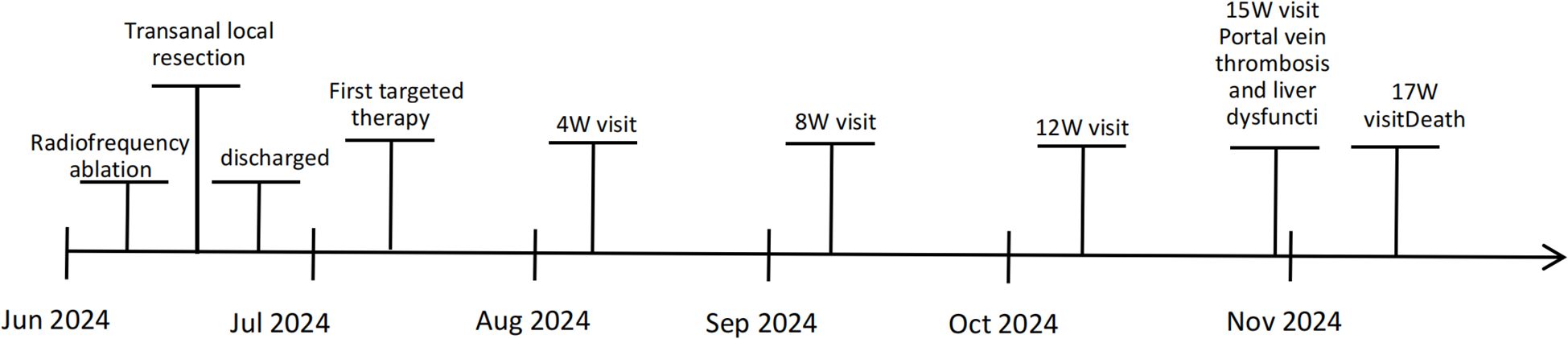 Conclusions: The combination of transanal local excision of the primary lesion and radiofrequency ablation of liver metastases, complemented by imatinib-targeted therapy, represents a feasible therapeutic strategy for advanced KIT-mutated anorectal mucosal melanoma. This strategy may prolong patient survival; however, potential adverse events require careful monitoring.