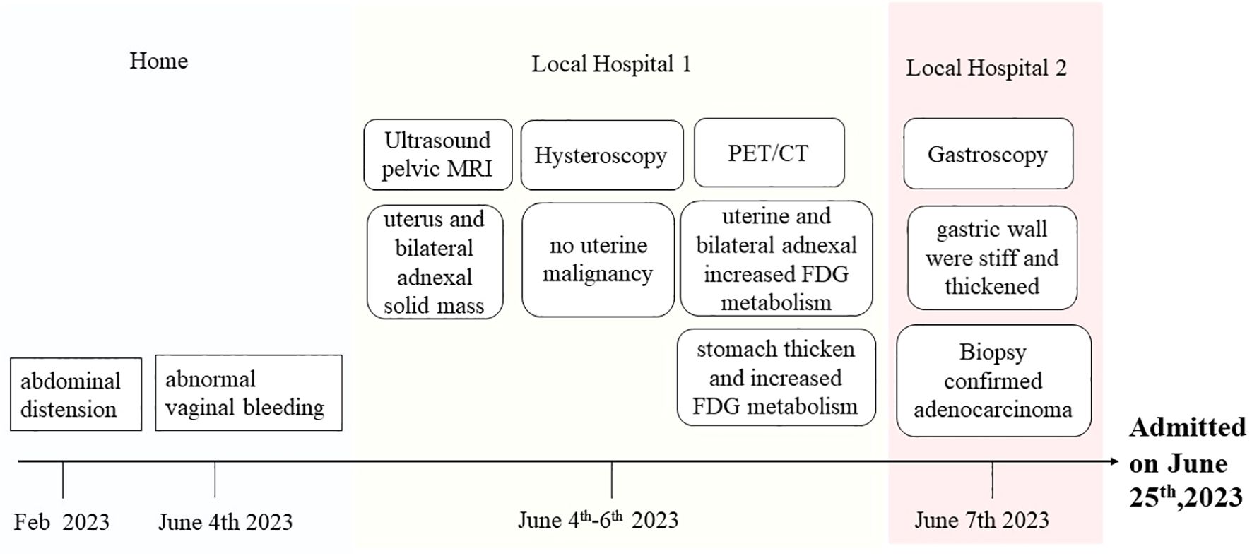 A 63-year-old woman was admitted to our hospital on June 25th, 2023, with the discovery of a malignant tumor in her stomach. In a review of the systems, she was found to be positive for abdominal distension after meals that persisted for 4 months, and experienced abnormal vaginal bleeding for 3 weeks, which prompted her to visit a local hospital. She had previously undergone a laparoscopic cholecystectomy at Ruijin Hospital for cholecystolithiasis treatment. In addition, she had no history of chronic diseases, surgeries, or alcohol or tobacco abuse. She gave birth once and had no history of miscarriage. She reached menopause at the age of 50 years and denied any personal or family history of cancer. No abnormalities were found during physical examination upon admission. Outpatient ultrasound and pelvic MRI at a local hospital revealed the presence of a solid mass in the uterus and bilateral adnexal areas. The medical team considered the possibility of bilateral primary malignant ovarian tumors or ovarian metastatic carcinoma. However, upon performing a hysteroscopy, no signs of uterine malignancy were revealed. Then she underwent a positron emission tomography/computed tomography (PET/CT) examination, which revealed a rare mirror inversion of the chest and abdominal organs. According to PET/CT examination reports, abnormally increased fluorodeoxyglucose (FDG) metabolism was observed in the uterine cavity and bilateral adnexal soft tissue. Given that the lesion affected both the adnexa and uterus, endometrial tumors, such as ovarian endometrioid malignant tumors and endometrial malignant tumors, were considered the most likely possibilities. Furthermore, examination revealed significant thickening of the stomach mucosa in the gastric body and antrum, including the greater and lesser curvatures, with abnormally increased FDG metabolism. This finding suggests the possibility of hypertrophic gastritis and malignant tumors (lymphoma or gastric cancer). No lesions were found during the previous hysteroscopy; hence, the patient was transferred to another hospital for gastroscopy. The results revealed that the gastric body and walls were stiff and thick, respectively. This condition involved the gastric angle and antrum. Biopsy confirmed the presence of a poorly differentiated adenocarcinoma, with some sections showing signet ring cell carcinoma. The patient was admitted to our hospital for surgery. The patient’s medical history during the visit is shown in Figure 1.
