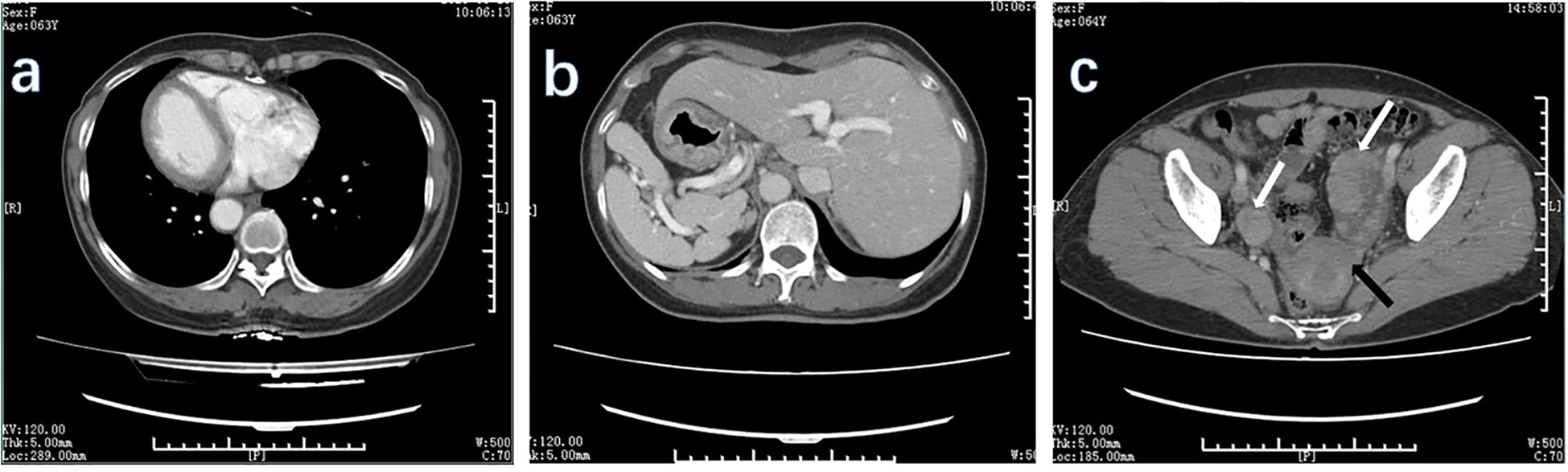 Figure 2. CT scan of the patient. The CT scan of this patient showed mirror inversion of the organs. (A) The patient’s chest organs were mirror-inverted. (B) The patient’s abdominal organs are mirror-inverted, and the gastric wall is thickened. (C) The patient’s pelvic organs show mirror inversion. White arrows show lesions in the adnexal region, and black arrows show lesions in the uterus.