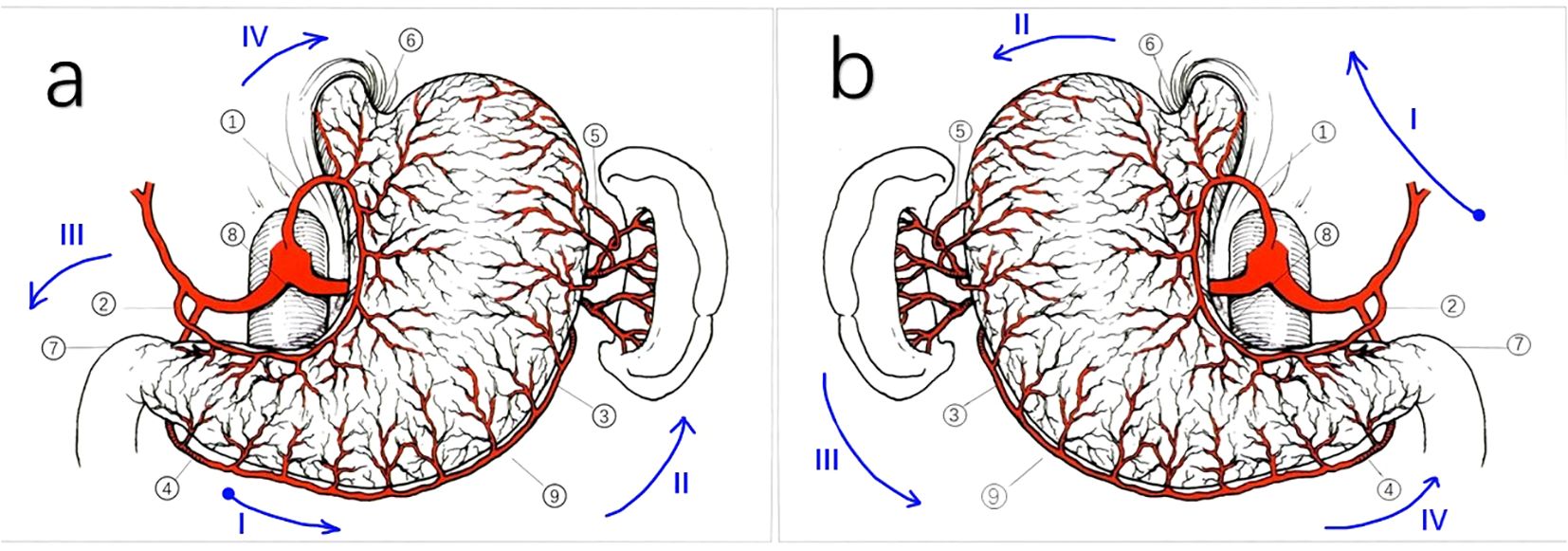 Figure 3. Schematic representation of the perigastric vessels in normal patients and patients with SIT. Schematic representation of the perigastric vessels in patients with SIT is a mirror inversion of. (A) Schematic representation of the perigastric vessels in normal patients. (1) Left gastric artery; (2) Right gastric artery; (3) Left gastroepiploic artery; (4) Right gastroepiploic artery; (5) Short gastric arteries; (6) Cardia; (7) Pylorus; (8) The lesser curvature; (9) The greater curvature. *: order in conventional surgery: (4) (3) (5) (2) (7) (1) (6). (B) Schematic representation of the perigastric vessels in our SIT case. (1) Left gastric artery; (2) Right gastric artery; (3) Left gastroepiploic artery; (4) Right gastroepiploic artery; (5) Short gastric arteries; (6) Cardia; (7) Pylorus; (8) The lesser curvature;(9)The greater curvature. *: order in our case: (2) (1) (6) (5) (3) (4) (7). The blue arrows in both (a, b) indicate the path of the surgical operation, with the blue dots representing the starting position. Roman letters represent surgical steps.