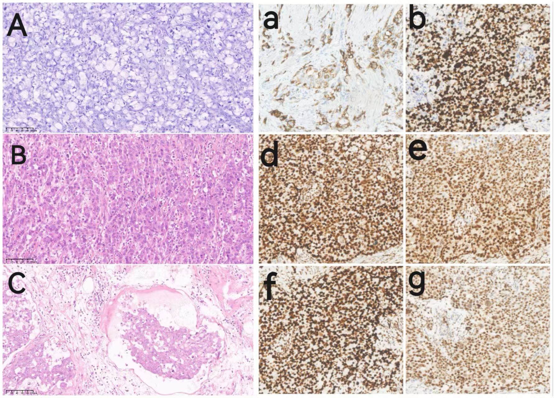 Figure 4. Pathological images of the patient. Images (A–C) show hematoxylin-eosin (HE) staining images of the pathological tissues(209magnification); Images (a, b, d–g) show immunohistochemical (IHC) images of the pathological tissues (209magnification): (A) HE staining for ovarian metastatic signet-ring cell carcinoma. (B) HE staining for gastric adenocarcinoma. (C) HE staining of gastric adenocarcinoma with intravascular tumor thrombus and visible signet ring cells. (a) IHC of CK7; (b) IHC of Ki-67; (d) IHC of MLH1; (e) IHC of MSH2; (f) IHC of MSH6; (g) IHC of PMS2.