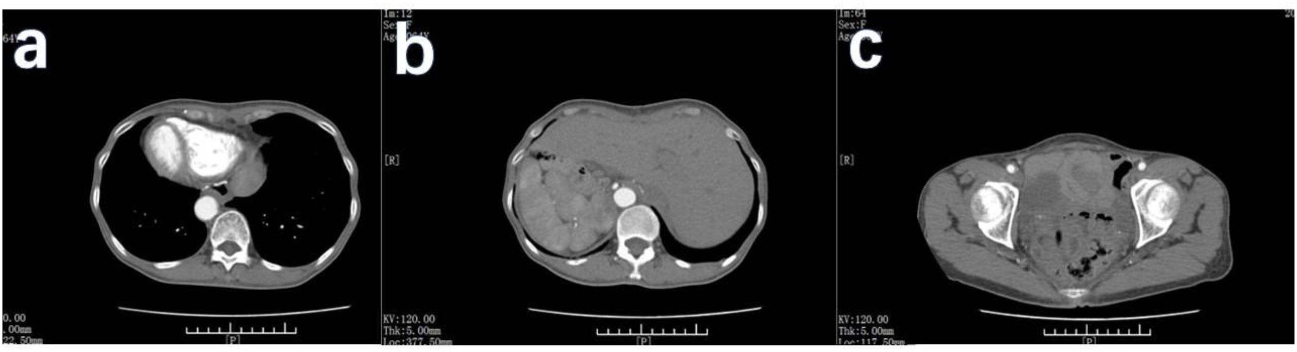 Figure 5. CT scan of the patient 11 months after the operation. (A) No new tumors were detected in the patient’s anastomotic area. (B) The patient’s liver was in mirror inversion, and no metastasis was found. (C) No new lesions in the patient’s pelvic area.