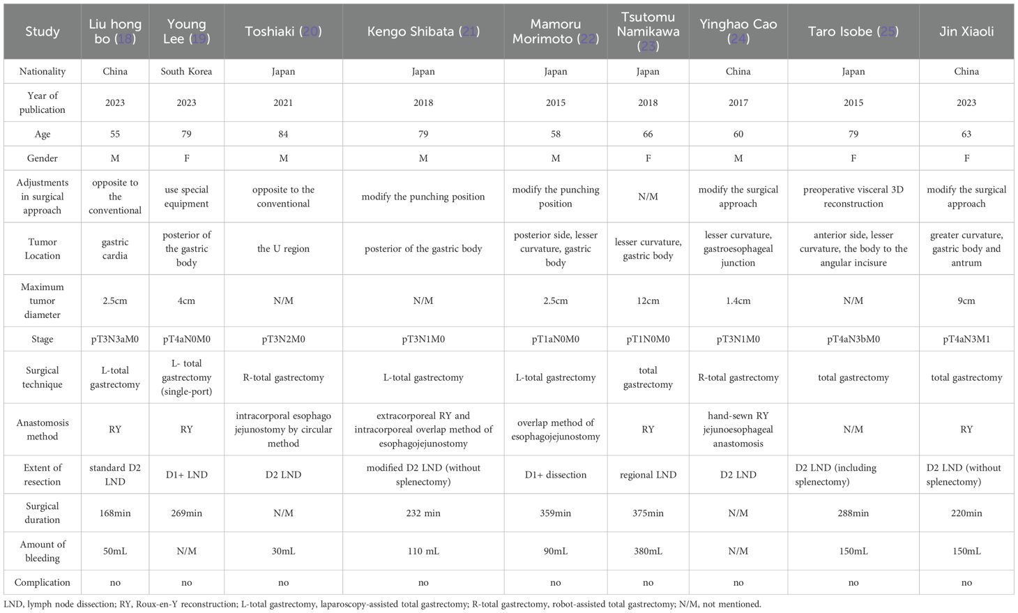 All cases were from Asia, with Japan being the majority (Table 1). Most patients had advanced gastric cancer, with only one case in the early stages. The main surgical approaches employed were laparoscopic or robot-assisted surgery, with only two patients (including the present case) undergoing open surgery. Nearly all reports mentioned preoperative or intraoperative adjustments to the surgical plan for patients with SIT, including adjustment of the position of the puncture hole, addition of special instruments, and preoperative 3D vascular reconstruction. As the literature consists of a limited number of case reports, descriptions of patient prognosis and outcomes mostly focus on surgical safety and the patient’s condition before the submission of the case. However, data on long-term prognosis and outcomes are lacking. A more comprehensive data analysis is needed to verify the long-term prognosis of patients with SIT undergoing total gastrectomy.