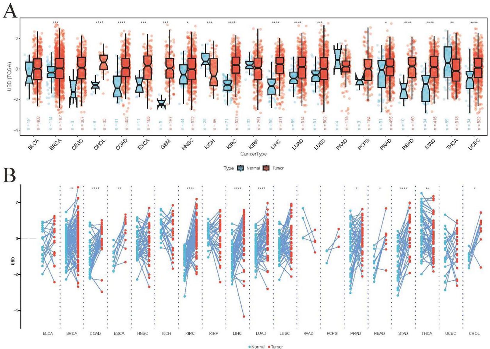 Figure 1. Differential UBD expression across human cancers. (A) Comparative analysis of UBD expression levels between tumor tissues and matched adjacent normal tissues across various cancer types in the TCGA cohort. (B) Integrated expression profile of UBD demonstrating differential expression between malignant tumors (TCGA dataset) and normal tissues (combined GTEx and TCGA normal samples) across multiple cancer types. * p < 0.05, ** p < 0.01, *** p < 0.001, **** p < 0.0001.