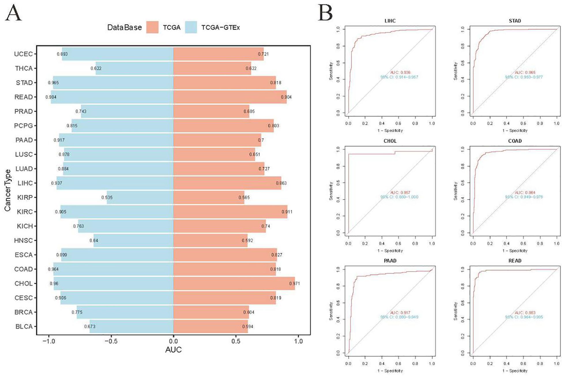 Chart A presents a bar graph comparing AUC values for various cancer types using TCGA and TCGA-GTEx databases, with TCGA in teal and TCGA-GTEx in orange. Chart B shows ROC curves for six cancer types: LIHC, STAD, CHOL, COAD, PAAD, and READ, each with AUC and 95% CI values indicated.