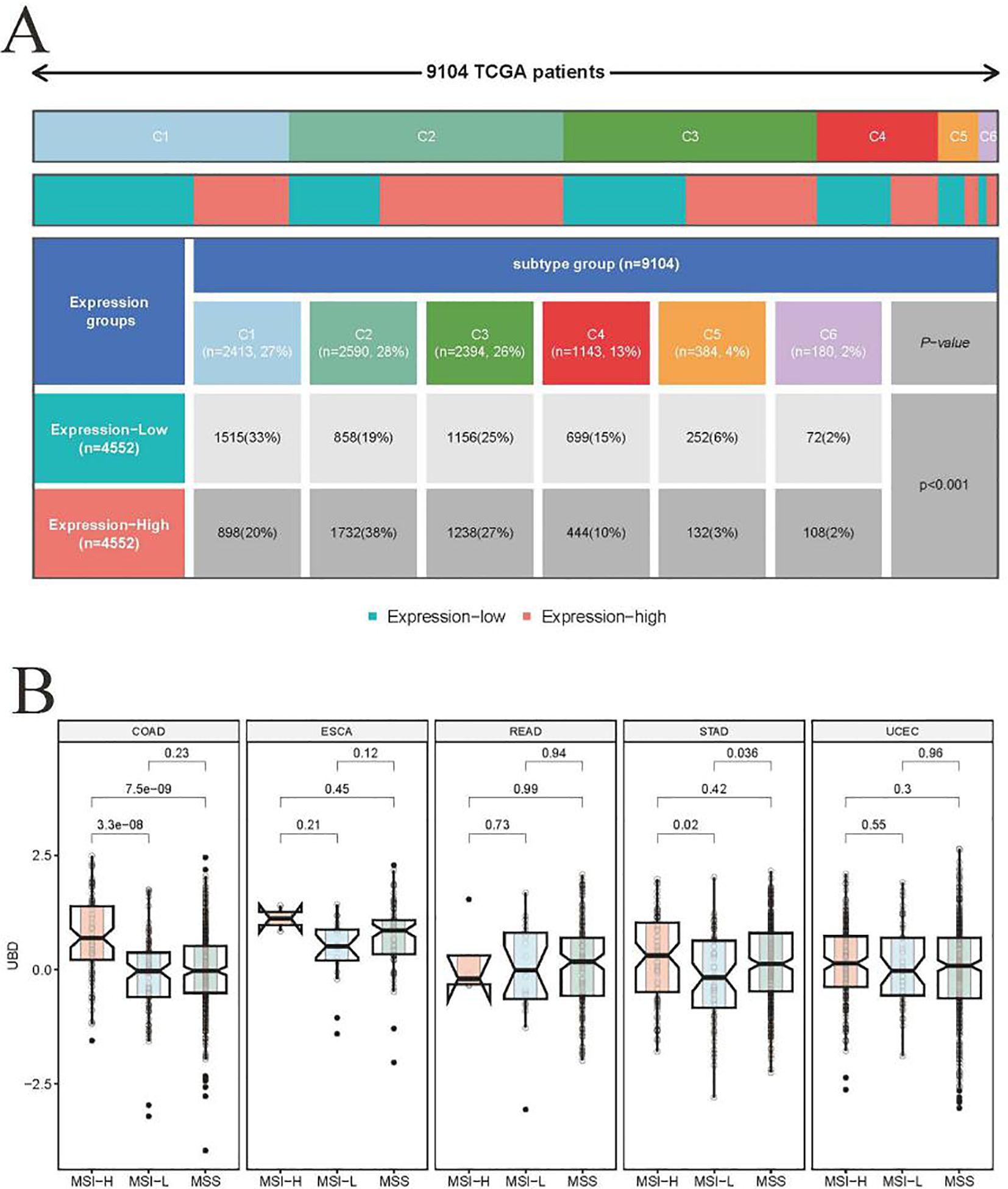 Figure 3. Association of UBD expression with pan-cancer molecular subtypes. (A) Stratification of immune subtypes (C1-C6) between high/low UBD expression groups (median mRNA expression cutoff) in the TCGA pan-cancer cohort. (B) Comparative analysis of UBD expression profiles across tumors with distinct microsatellite status in cancers (TCGA dataset).