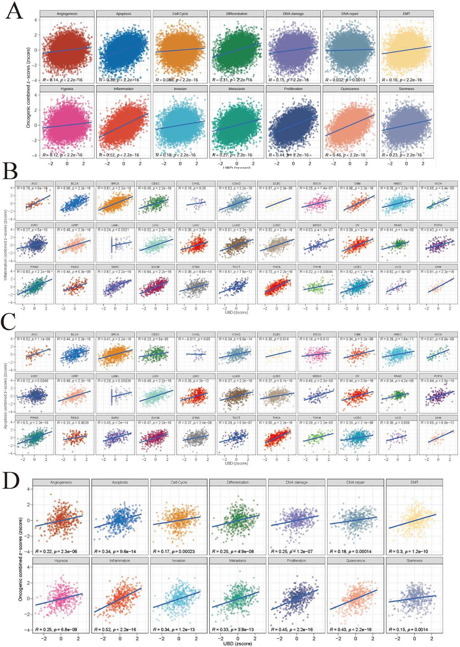 Figure 4. Functional landscape of UBD-associated cancer pathways (A) Pan-cancer enrichment analysis of 14 oncogenic pathways correlated with UBD expression (TCGA pan-cancer cohort). Spearman correlation coefficients between UBD expression and inflammation (B) and apoptosis (C) across 33 cancer types (TCGA dataset). (D) In TCGA-COAD cohort, the correlation between UBD expression and 14 oncogenic pathways.
