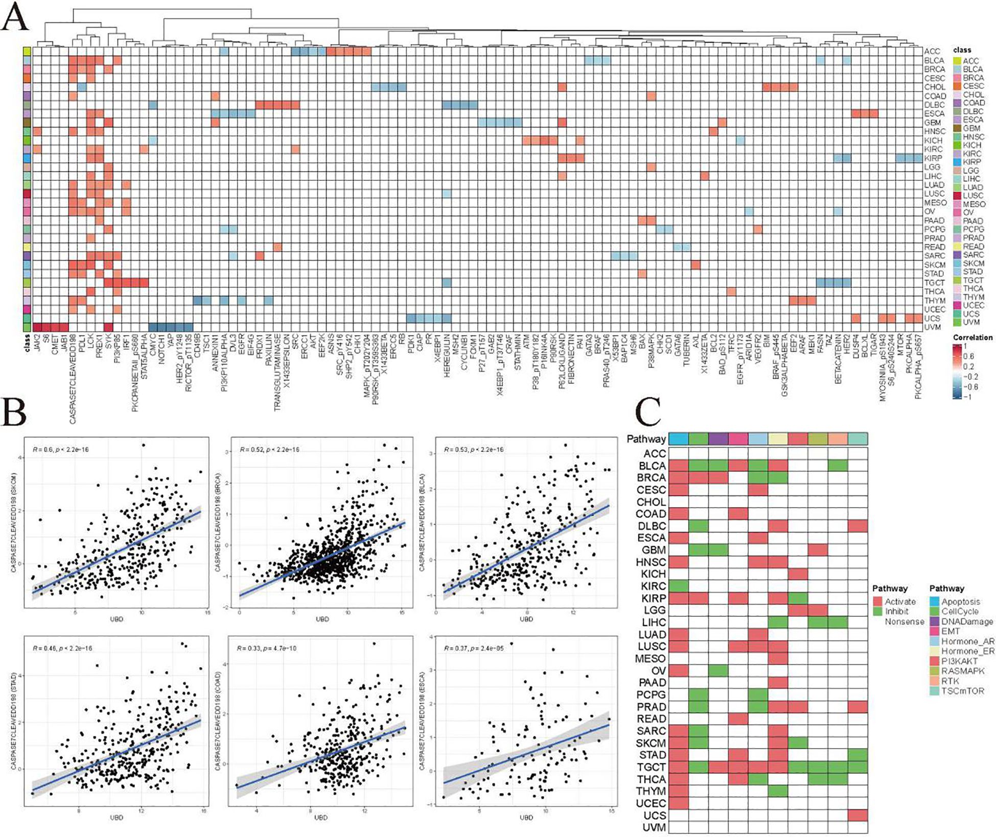 Figure 5. Co-expression patterns of UBD and pathway functional proteins in the TCPA database. (A) Additionally, a rank-based association analysis was employed to evaluate the relationship between UBD mRNA levels and the expression of functional proteins measured by Reverse Phase Protein Array (RPPA) in the TCPA database. (B) Correlation analysis between Caspase-7 (cleaved at D198) and UBD. (C) Proteomic enrichment analysis from the TCPA database presents a heatmap of activated or suppressed pathways in patients with high/low UBD expression.