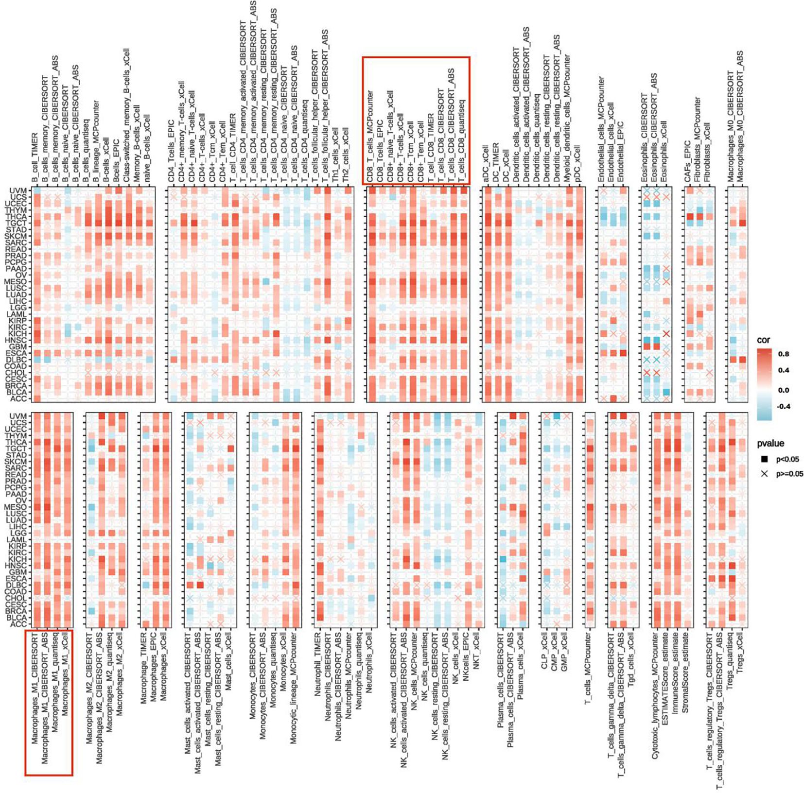 Heatmap displaying correlation coefficients between various genes and cell types, with red indicating positive correlations and blue indicating negative correlations. The color intensity reflects the strength of the correlation. Columns represent different cell types, while rows represent various genes. Significant p-values are marked with black squares for p ≤ 0.05 and X's for p > 0.05. The red outlines highlight specific areas of focus for certain cell types and genes.