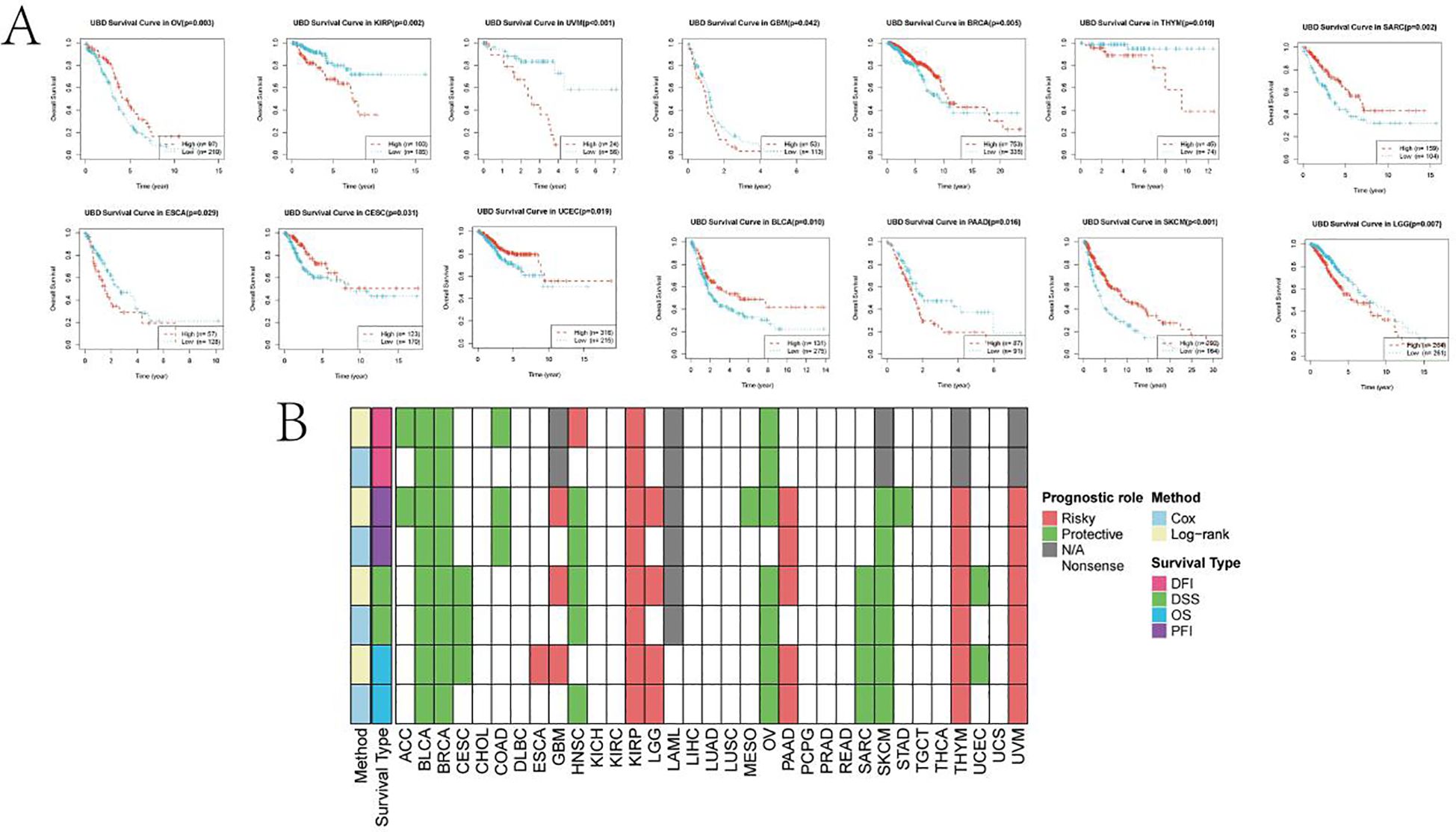 Figure 8. KM analysis of UBD. (A) KM survival curves demonstrating UBD prognostic utility in overall survival (OS) across: Protective subgroups: KIRP, UVM, ESCA, THYM, PAAD, and LGG; High-risk subgroups: OV, CESC, UCEC, BRCA, BLCA, SKCM, and SARC. (B) Heatmap depicting the pan-cancer prognostic landscape of UBD expression.