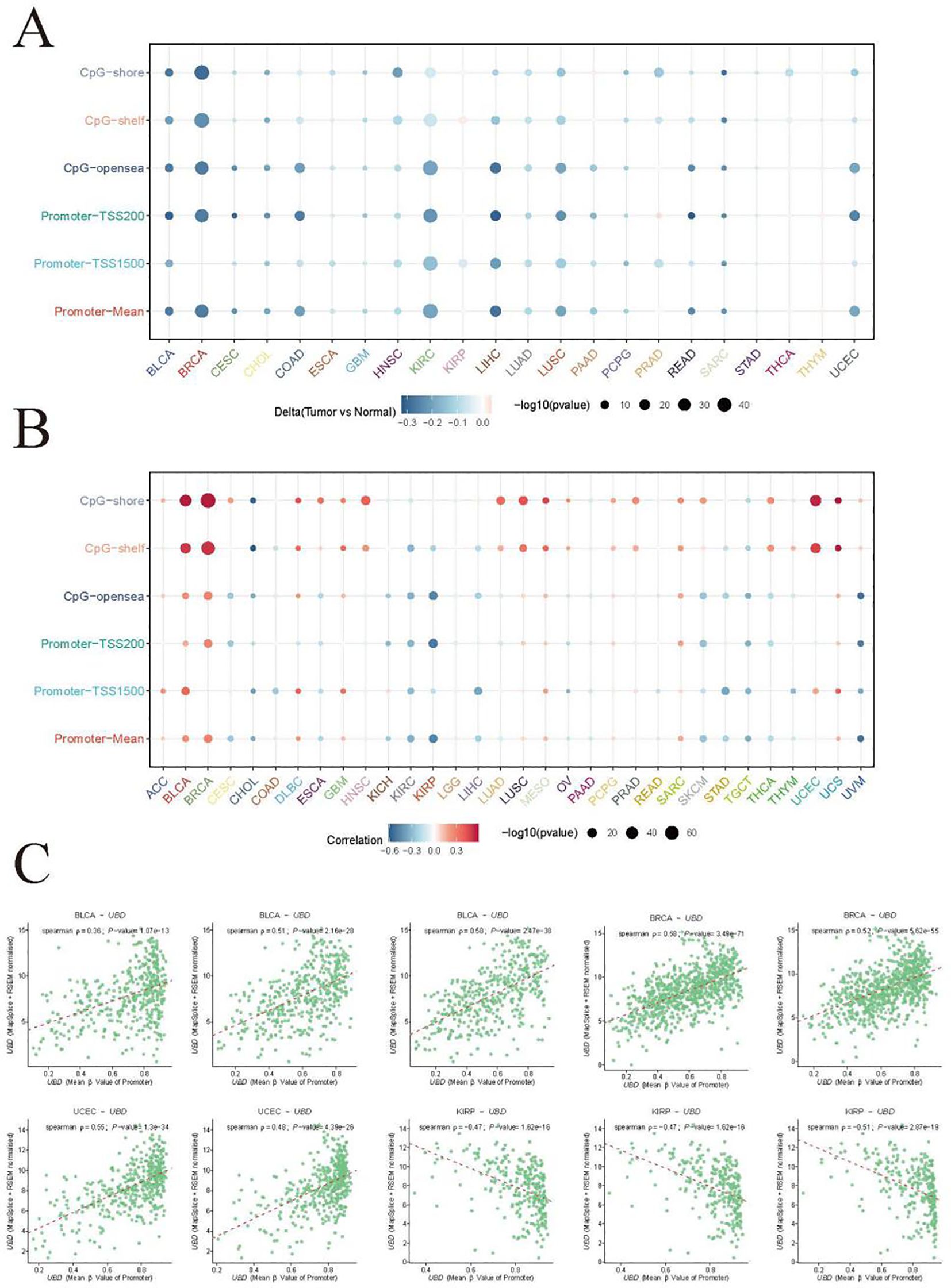 Diagram with three panels showing data visualizations. Panel A: Bubble chart measuring delta tumor versus normal across gene regions and cancer types. Panel B: Bubble chart showing correlation between gene regions and cancer types. Panel C: Scatter plots displaying correlations between promoter values and expression levels across various cancers. Legends provide scale for delta, correlation, and p-value metrics.