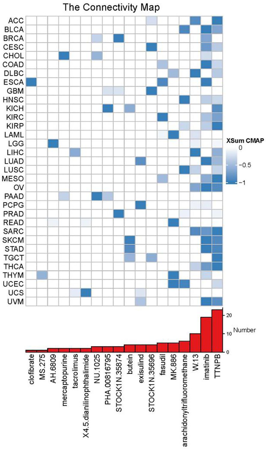 Heatmap titled “The Connectivity Map” displaying blue shaded cells representing connectivity scores across various cancer types labeled on the left. A bar chart below in red shows counts for different compounds, with TTNPB and imatinib having the highest frequencies.