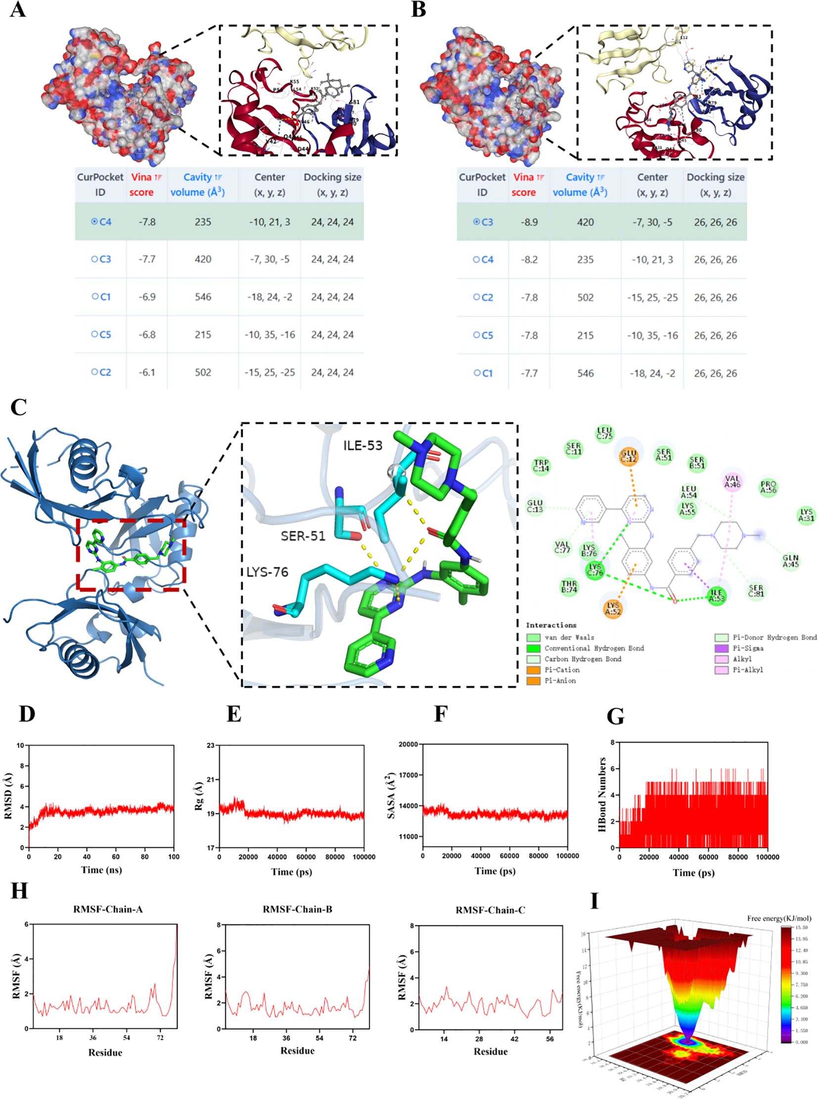 Molecular docking analysis and interaction assessment images. Panels A and B show 3D molecular structures with insets highlighting specific interactions, alongside tables of docking parameters such as CurPocket ID, Vina score, cavity volume, center coordinates, and docking size. Panel C presents a detailed view of molecular interactions, with a legend indicating types such as van der Waals and hydrogen bonds. Graphs D through G display Root Mean Square Deviation (RMSD), Radius of Gyration (Rg), Solvent Accessible Surface Area (SASA), and hydrogen bond numbers over time. Panels H and I feature residue-specific analysis and a 3D plot of free energy.