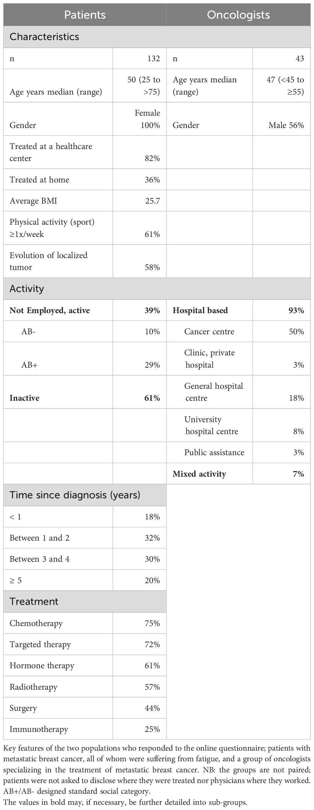 To better understand the current standard of care provided for ABC patients with CRF/CTRF and the management options available to them, an online survey in French was implemented. Study participants were recruited via the associations Collectif 13/10, Europe Donna France, Les Lionnes de Tatooine and AFSOS from a database of around 2,000 patients. Between July and September 2023, metastatic breast cancer patients undergoing treatment and oncologists caring for patients with MBC, replied using a self-completed questionnaire (Supplementary Data 1, 2). This comprised a series of open or closed questions, 47 for patients and 34 for doctors, which allowed data reflecting both patients’ and physicians’ perspectives of fatigue and its management in metastatic breast cancer to be collected. After a brief screening section, both groups responded to questions related to their experience of the care pathway (9 questions for patients and 7 for oncologists), the management of fatigue (19 and 17 questions, respectively) and difficulties encountered by oncologists (2 questions for each group). In each of these sections there were a number of answers which allowed mirror-image analysis (Supplementary Appendix 3). For some questions, a numerical scale from 0 (not at all) to 10 (always) was employed, while others proposed single or multiple-choice answers. Only significant and relevant differences (95%; +/- 3pts) were indicated. A selection of the results most relevant to the aims of this paper, namely to reach a consensus on priority actionable recommendations for evaluating and alleviating fatigue in ABC patients, thus improving their treatment response, physical capability and enhancing their Quality of Life (QoL) is described below.
