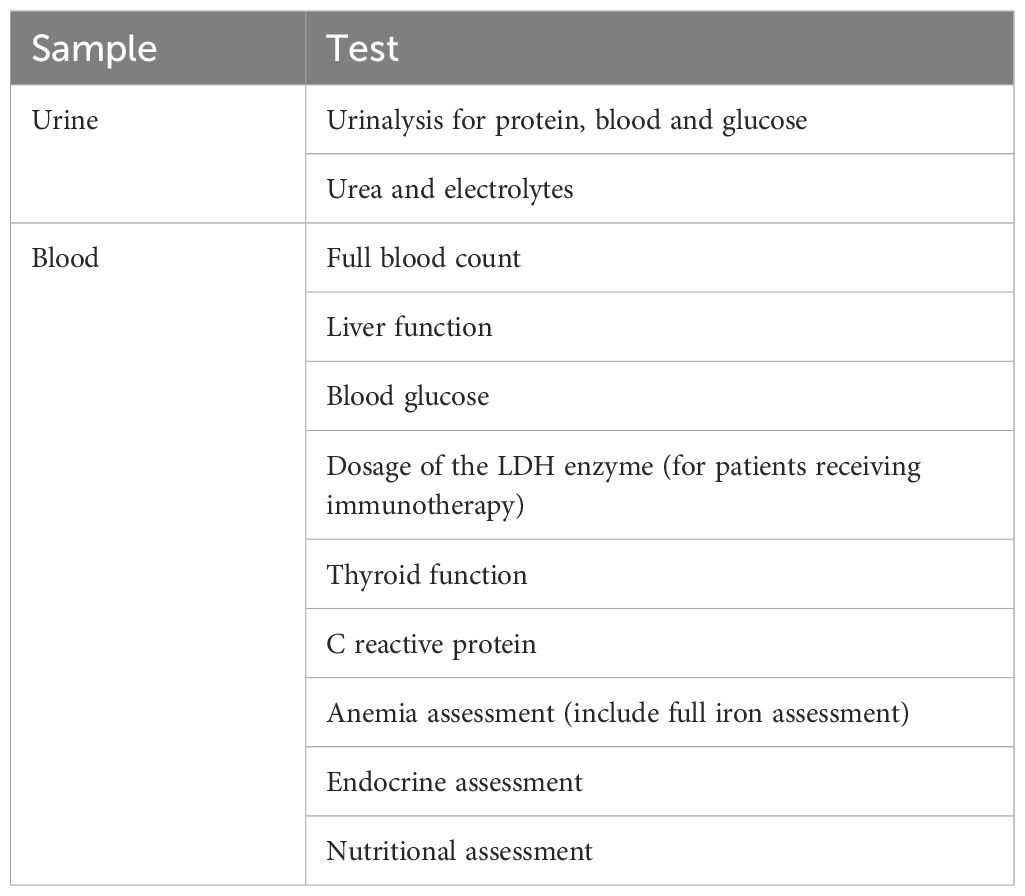 Following the initial fatigue screening, the following step focuses on the diagnostic assessment of CTRF and its constituent factors. The panel advises a continuous evaluation of CTRF and recommends the assessment of contributing factors that may necessitate treatment. These factors include pain, nausea, anemia, sleep disturbances, malnutrition, sarcopenia, physical inactivity, cognitive dysfunction, and emotional distress, including anxiety (7, 40). The consideration of laboratory tests, as detailed in Table 3, is encouraged (7). Importantly, the evaluation of these contributing factors should be an ongoing process to determine their impact on CTRF over time and to assess whether they too are linked to the administration of anticancer therapy. The level of a patient’s fatigue should be assessed before initiating any new anticancer treatment. This pre-treatment assessment allows HCPs to establish a baseline understanding of the patient’s fatigue levels and related symptoms. It provides essential information for tailoring the treatment plan to the patient’s specific needs and addressing any potential issues related to cancer-related fatigue. Furthermore, when evaluating fatigue-related manifestations, it is essential to consider the social and environmental contributors, such as a patient’s need to maintain employment during treatment (7, 11). In this context, the panel recommends tailoring the treatment plan to meet the specific needs of each individual patient.