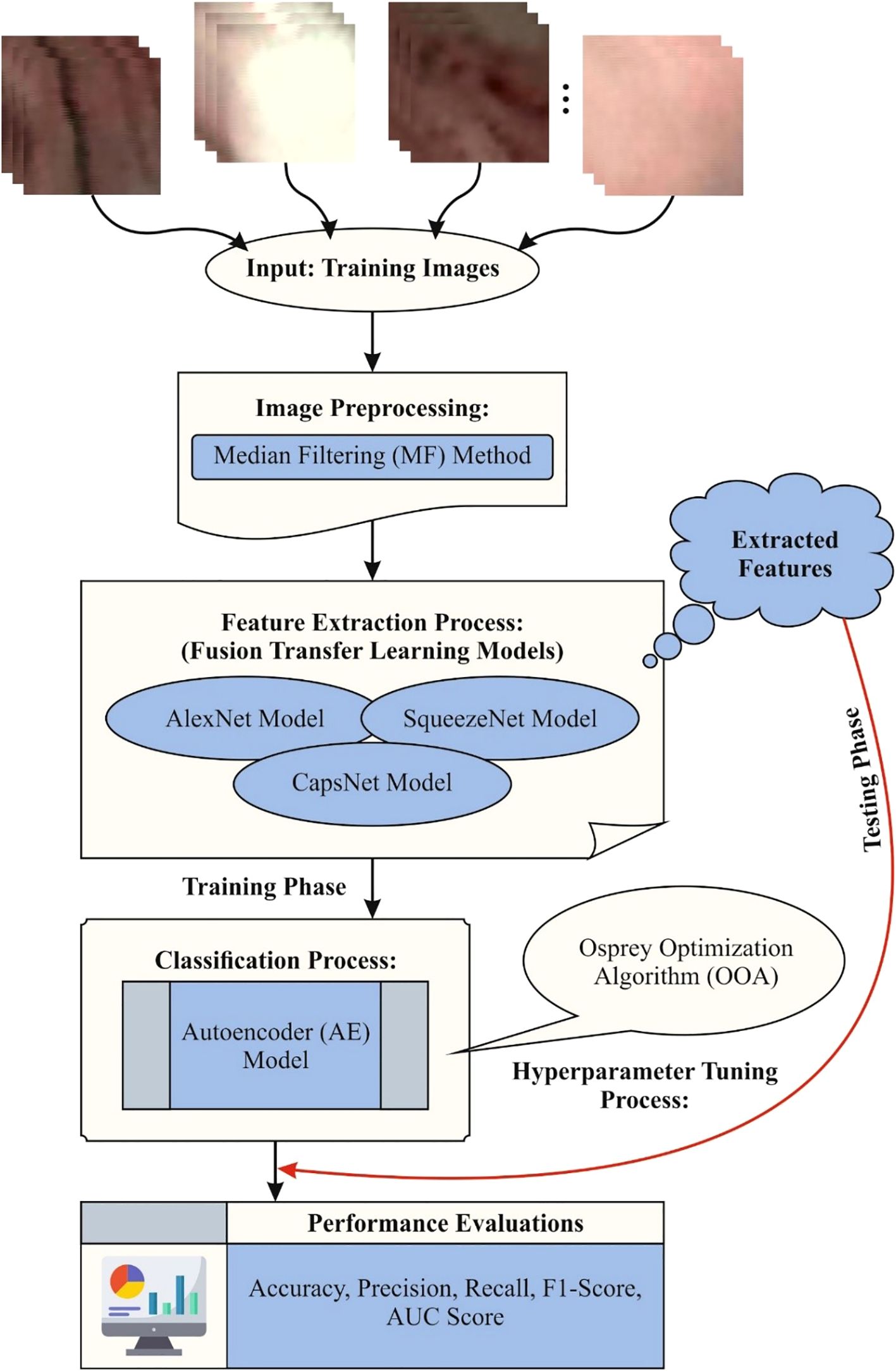 Methods: In this study, the Clinical Diagnosis of Laryngeal Cancer via Histology Images using the Fusion Transfer Learning and the Osprey Optimisation Algorithm (CDLCHI-FTLOOA) model is proposed. The aim is to improve the LC detection outcomes using histology image analysis to improve the patient’s life. Initially, the CDLCHI-FTLOOA model utilizes median filtering (MF)-based noise elimination during the image pre-processing process. Furthermore, the feature extraction process is performed by using the fusion models, namely AlexNet, SqueezNet, and CapsNet. The autoencoder (AE) method is employed for classification. To improve model performance, the Osprey Optimisation Algorithm (OOA) method is used for hyperparameter tuning to choose the optimal parameters for improved accuracy.