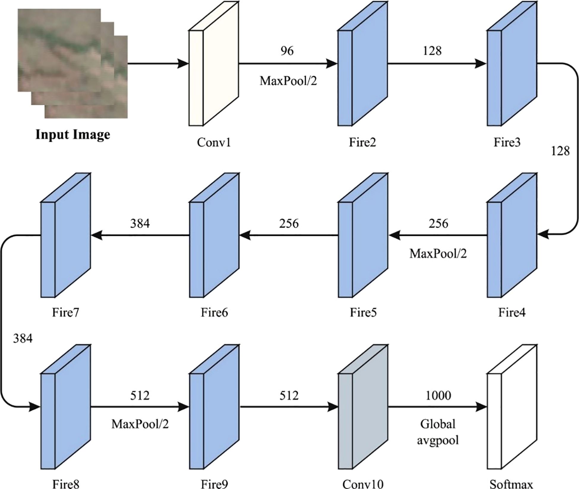 SqueezeNet is a special DCNN structure that is specially designed for effective and low‐power outcome (30). It is tailored to attain higher precision in image classification tasks while reducing computational resources and the model’s size. The structure begins with an input tensor (64, 64, 3) and three color components (RGB). Then, it upgrades the over-layer sequences that contain pooling and convolutional processes. Particularly, the SqueezeNet method combines the distinguishing features named ‘fire modules’. This module includes parallel 1×1 and 3×3 convolutions that are tailored for balancing both model clarity and computational complexity. Following the fire units, the system incorporates additional convolutional layers, a dropout layer for normalization, a 1×1 convolution layer to improve the attributes, and a global average pooling layer for reducing the dimensions. This structure results in a dense layer output using the Softmax activation function, enabling multi-class classification. Categorical cross-entropy is applied as the loss function. The performance of the method is assessed according to accuracy, a metric used to determine its efficiency in the precise categorization of the images. It outshines its capability to attain higher accuracy in image classification tasks, thus making it very important for settings where effectiveness and lower‐power conclusions are dominant. Figure 2 shows the architecture of the SqueezNet technique.
