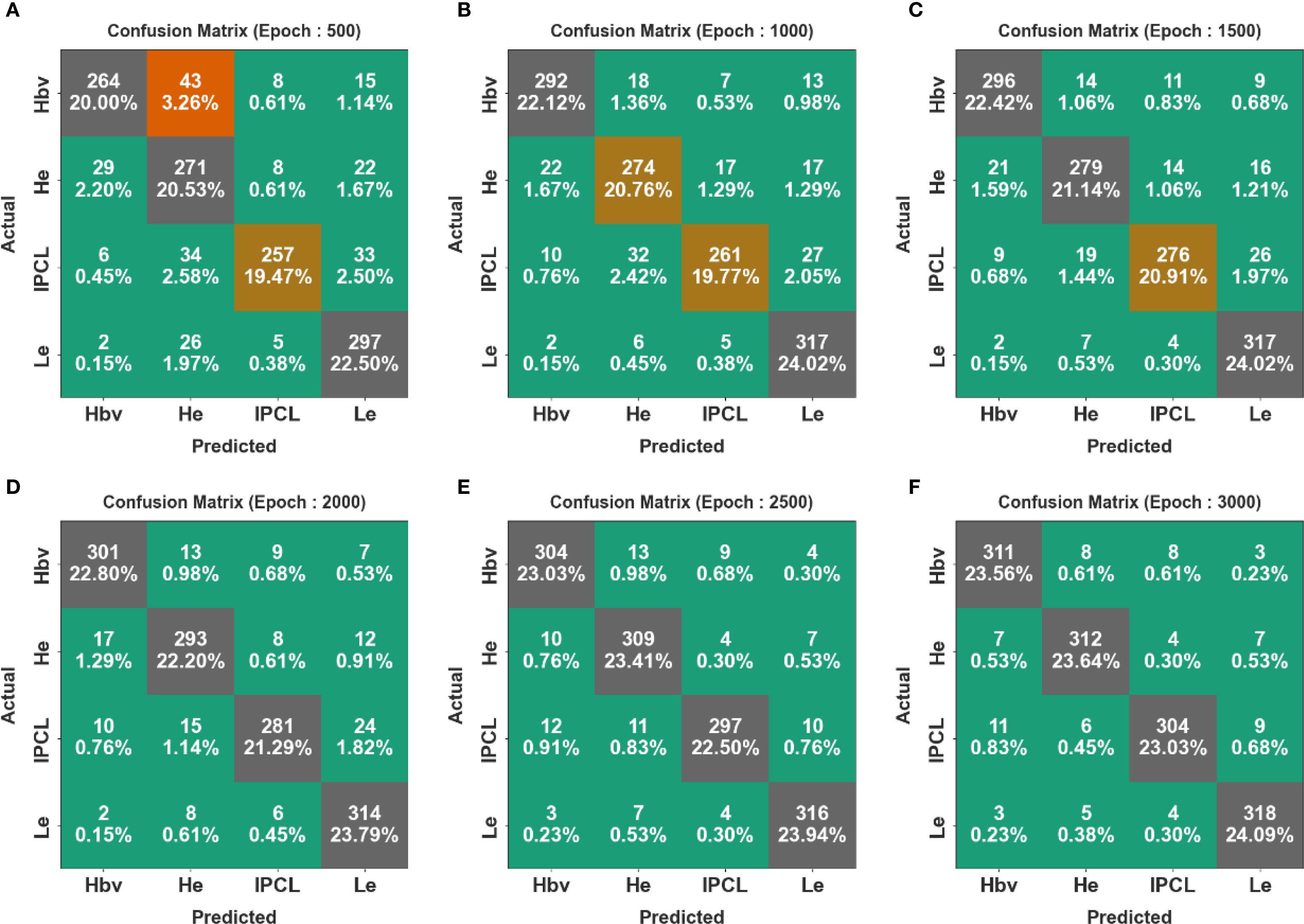 This section discusses the experimental outcomes of the CDLCHI-FTLOOA model under the laryngeal dataset (34). This dataset comprises 1,320 patches of early-stage and healthy cancerous laryngeal tissues, classified under four classes, namely, Hypertrophic Blood Vessels (HBV), Healthy Tissue (He), Abnormal IPCL-like Vessel (IPCL), and Leukoplakia (Le). The patches (100x100 pixels) were extracted from 33 narrow-band laryngoscopic images of 33 dissimilar patients, affected by laryngeal spinocellular carcinoma (analyzed after histopathological inspection). The complete details of this dataset are shown in Table 1. Figure 3 illustrates a set of sample images.