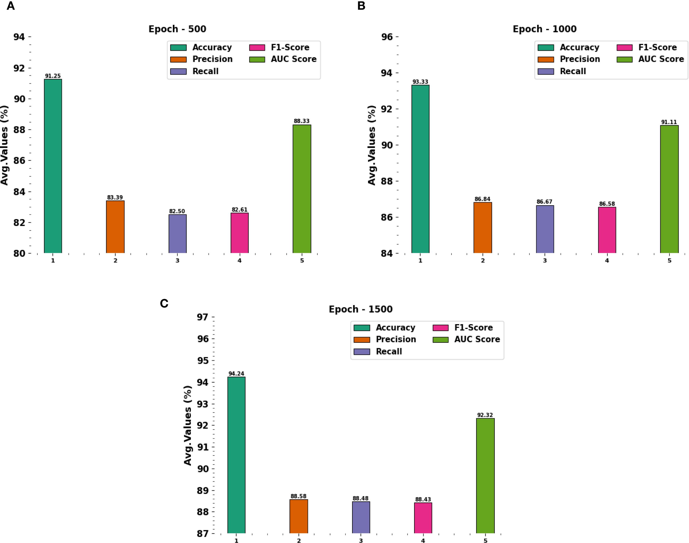 Figure 5 portrays the average outcomes achieved by the CDLCHI-FTLOOA technique under 500 to 1500 epochs. On 500 epochs, the CDLCHI-FTLOOA technique achieved the average , , , , and of 91.25%, 83.39%, 82.50%, 82.61%, and 88.33% respectively. Moreover, on 1,000 epochs, the CDLCHI-FTLOOA technique attained an average , , , , and of 93.33%, 86.84%, 86.67%, 86.58%, 91.11% correspondingly. Additionally, on 1,500 epochs, the CDLCHI-FTLOOA method achieved an average , , , , and of 94.24%, 88.58%, 88.48%, 88.43%, 92.32% respectively.