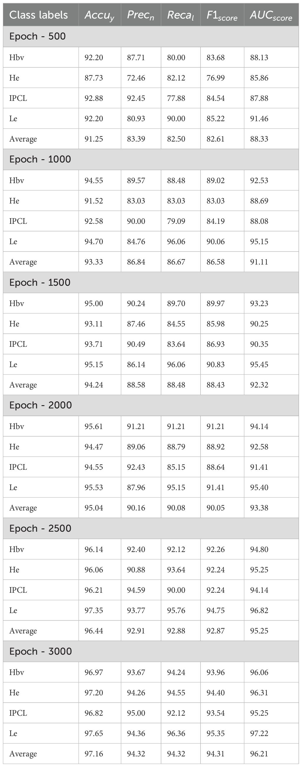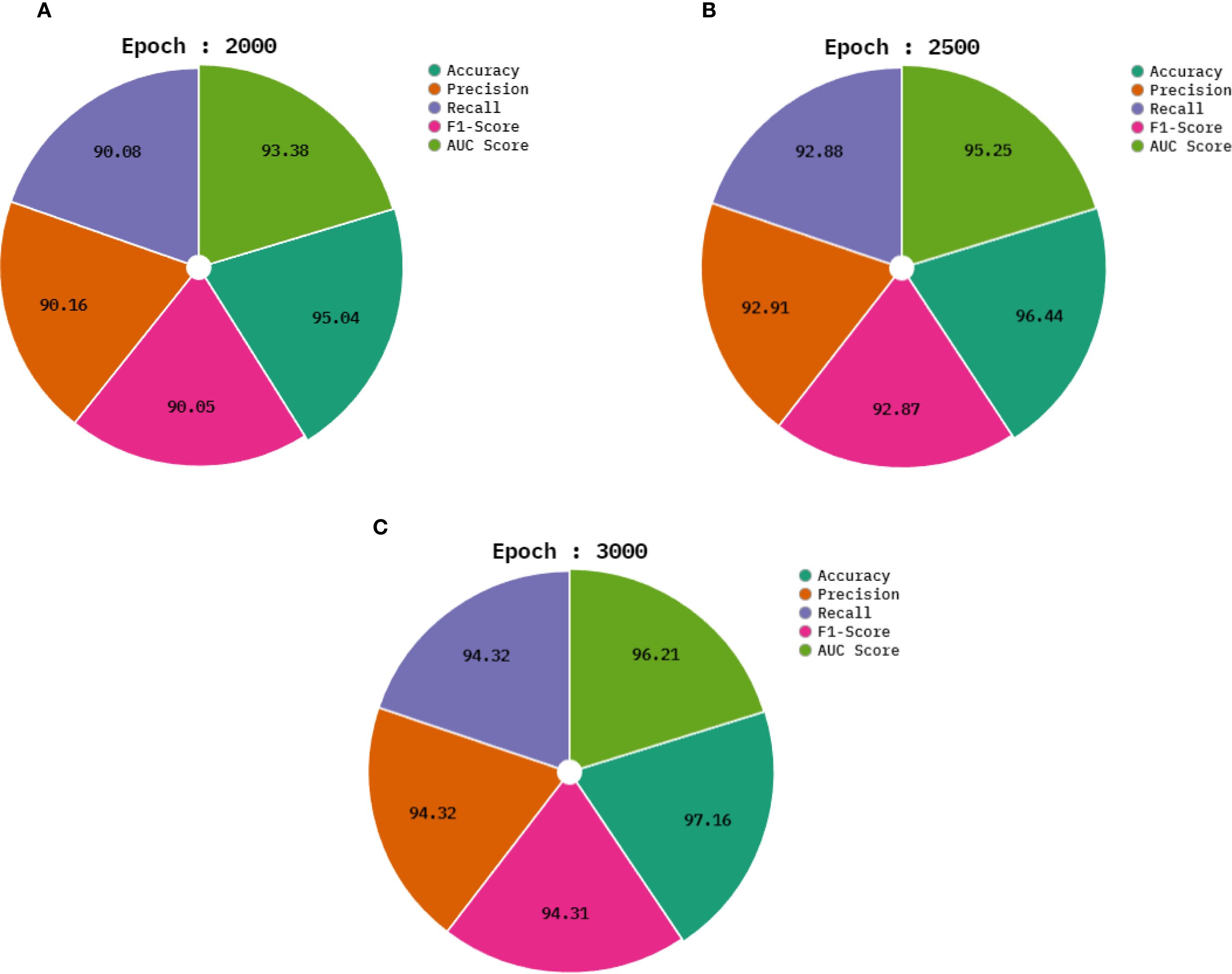 In Table 2 and Figure 6, the average outcomes of the CDLCHI-FTLOOA technique under 2000 to 3000 epochs are shown. On 2,000 epochs, the CDLCHI-FTLOOA model attained an average , , , , and of 95.04%, 90.16%, 90.08%, 90.05%, 93.38% respectively. In addition to this, on 2,500 epochs, the CDLCHI-FTLOOAs model attained an average , , , , and of 96.44%, 92.91%, 92.88%, 92.87%, 95.25% correspondingly. Furthermore, on 3,000 epochs, the CDLCHI-FTLOOAs model attained an average , , , , and of 97.16%, 94.32%, 94.32%, 94.31%, 96.21%, respectively.