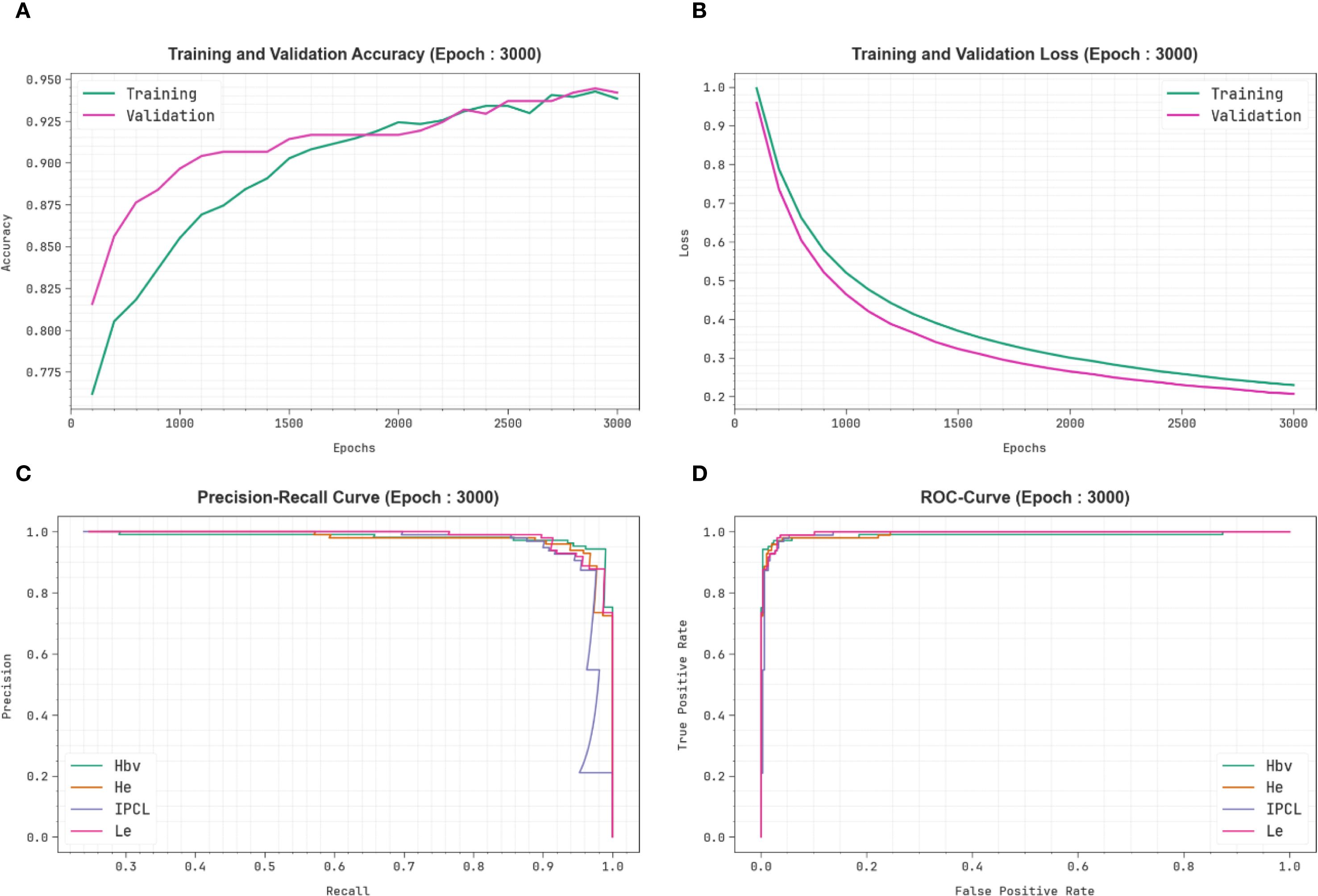 Figure 7 exhibits the classification outcomes of the CDLCHI-FTLOOA model. Figure 7A depicts the accuracy analysis results attained by the CDLCHI-FTLOOA model. The figure infers that the CDLCHI-FTLOOA method achieved increasing values over an increasing number of epochs. Next, Figure 7B exemplifies the result from the loss analysis of the CDLCHI-FTLOOA method. The outcomes specify that the proposed method accomplished closer training and validation loss values. Figure 7C reveals the PR examination outcome of the CDLCHI-FTLOOA technique. The findings indicate that the CDLCHI-FTLOOA technique produced an increase in the PR values. Lastly, Figure 7D portrays the ROC analysis outcome of the CDLCHI-FTLOOA technique. The figure infers that the projected system increased the ROC values.
