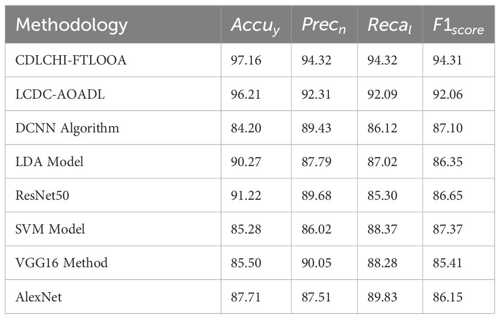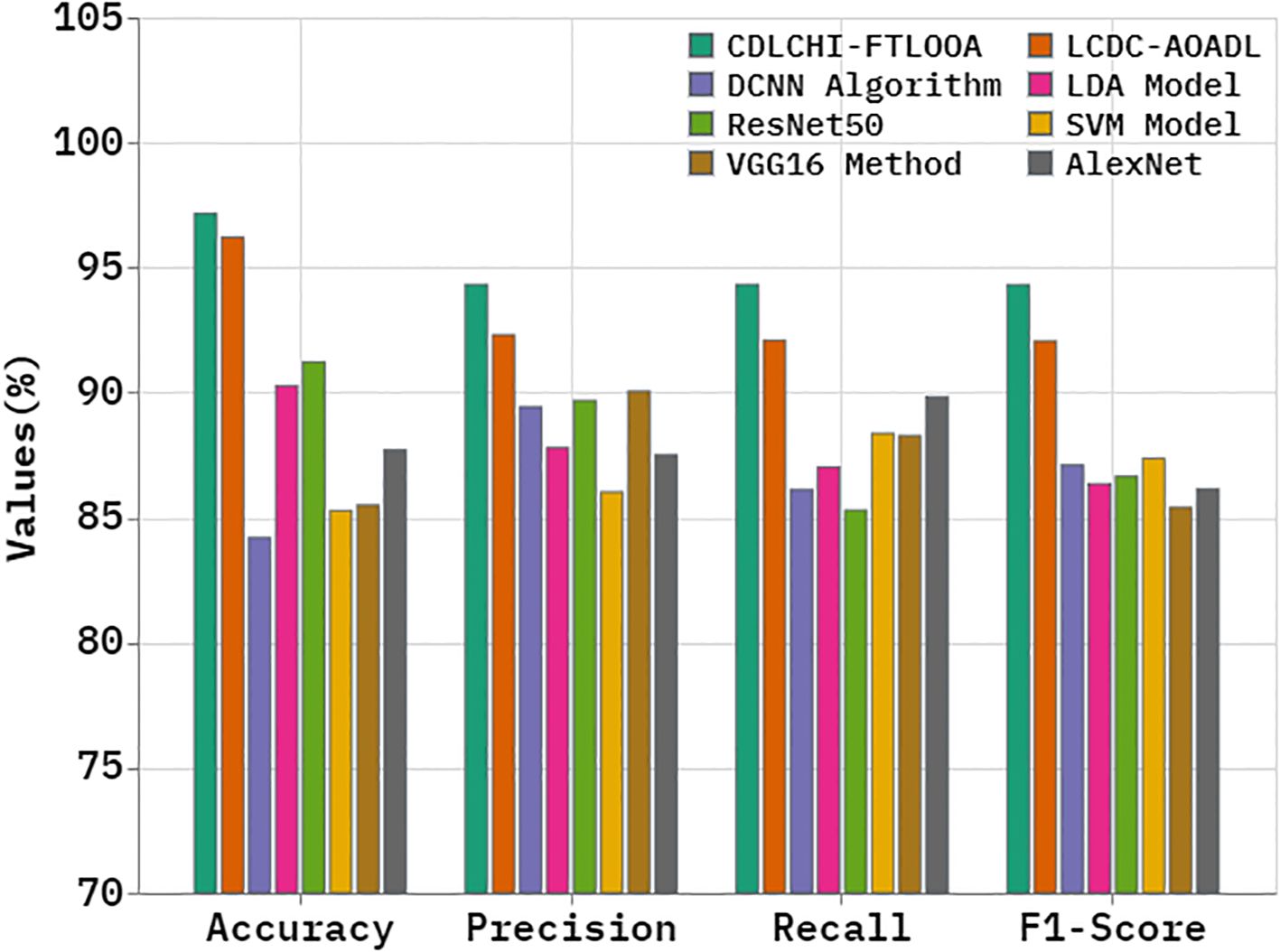 A comparative analysis was conducted between the CDLCHI-FTLOOA method and other advanced techniques, and the outcomes are shown in Table 3 and Figure 8 (5, 35). In terms of , the CDLCHI-FTLOOA method achieved a maximum of 97.16%. In contrast, the LCDC-AOADL, DCNN, LDA, ResNet50, SVM, VGG16, and AlexNet models attained lower values such as 96.21%, 84.20%, 90.27%, 91.22%, 85.28%, 85.50%, and 87.71%, correspondingly. Similarly, in terms of , the CDLCHI-FTLOOA method accomplished a maximum of 94.32% while the LCDC-AOADL, DCNN, LDA, ResNet50, SVM, VGG16, and AlexNet models achieved the least values, such as 92.31%, 89.43%, 87.79%, 89.68%, 86.02%, 90.05%, and 87.51%, respectively. In terms of , the CDLCHI-FTLOOA technique attained the highest of 94.31% while the LCDC-AOADL, DCNN, LDA, ResNet50, SVM, VGG16, and AlexNet models attained lower values, such as 92.06%, 87.10%, 86.35%, 86.65%, 87.37%, 85.41%, and 86.15%, correspondingly.