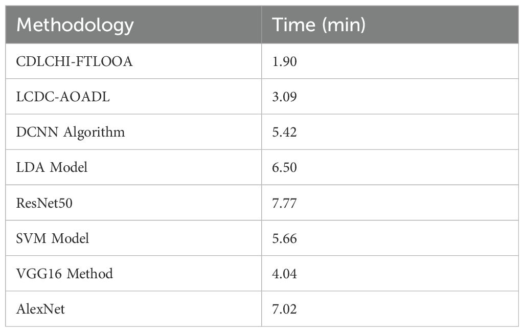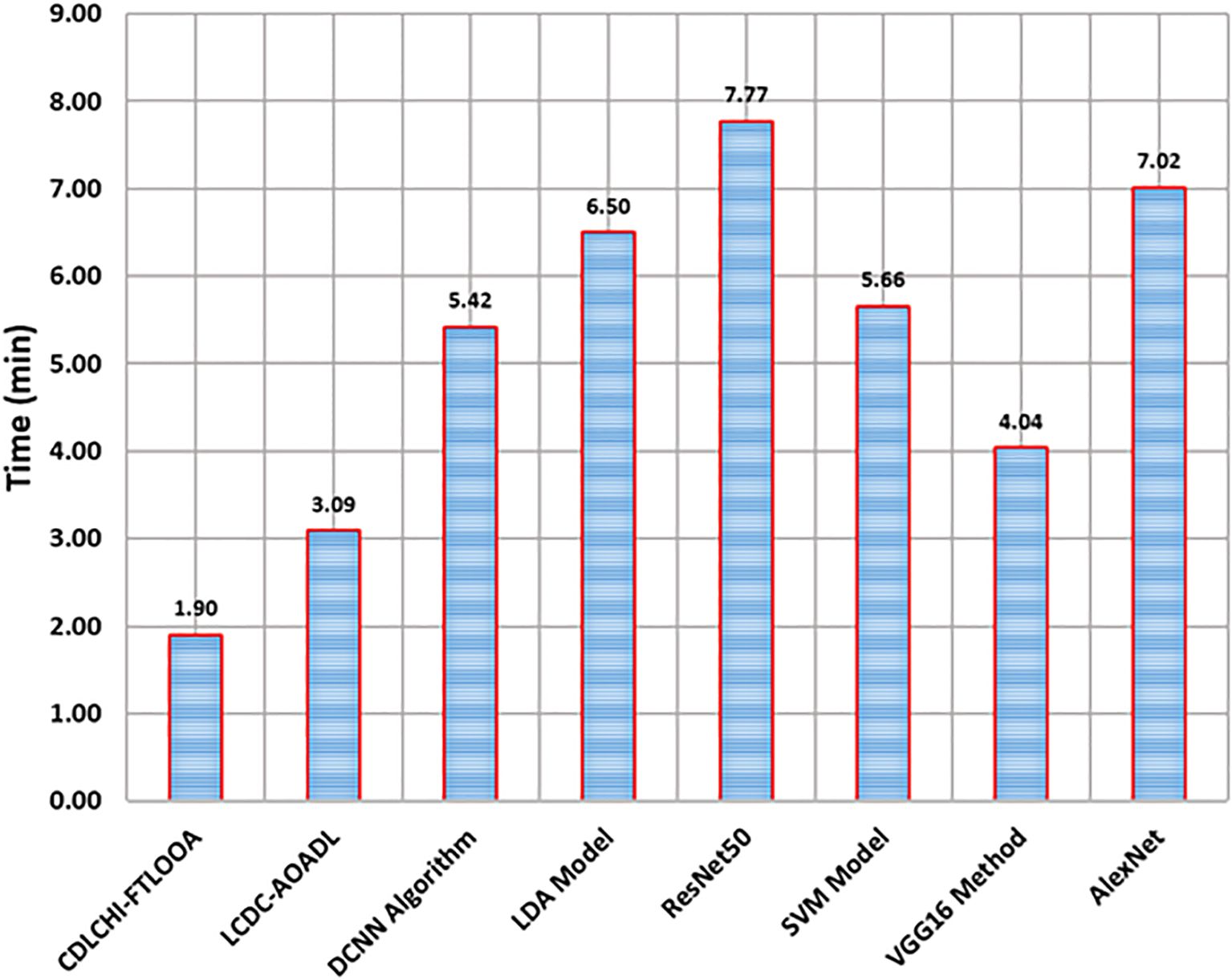 Table 4 and Figure 9 demonstrate the comparative analysis outcomes of the CDLCHI-FTLOOA method and other methods in terms of execution time. The introduced CDLCHI-FTLOOA technique consumed the least possible time, i.e., 1.90min, whereas the LCDC-AOADL, DCNN, LDA, ResNet50, SVM, VGG16, and AlexNet methods took larger times, such as 3.09min, 5.42min, 6.50min, 7.77min, 5.66min, 4.04min, and 7.02min, respectively.
