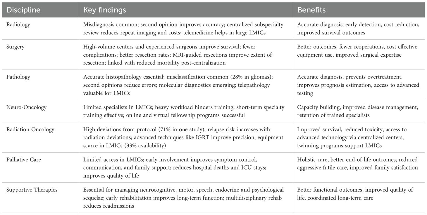 Table 1. Depicts the key findings of every discipline and benefits of sub specialization and centralization of pediatric neuro-oncology services.