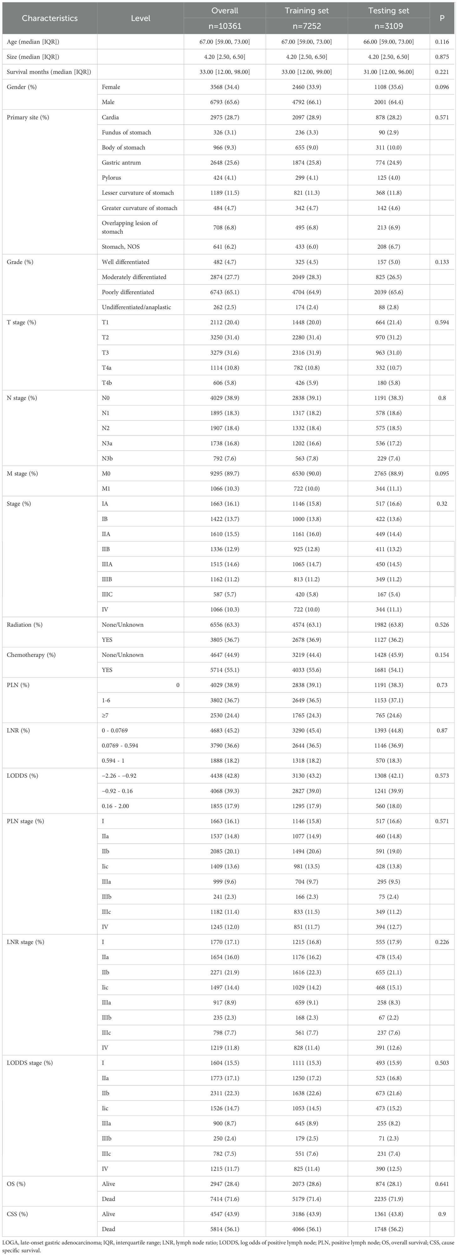 A total of 10,361 patients diagnosed with LOGA extracted from the SEER database were randomly divided into training and testing sets. As presented in Table 1, no statistically significant differences in clinicopathological parameters were observed between the two groups (p>0.05).