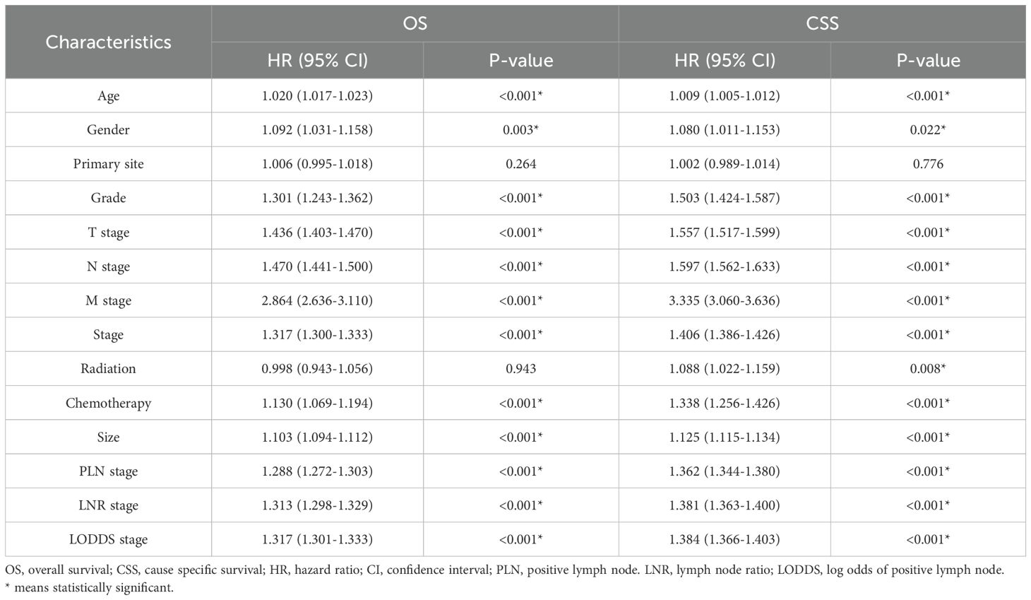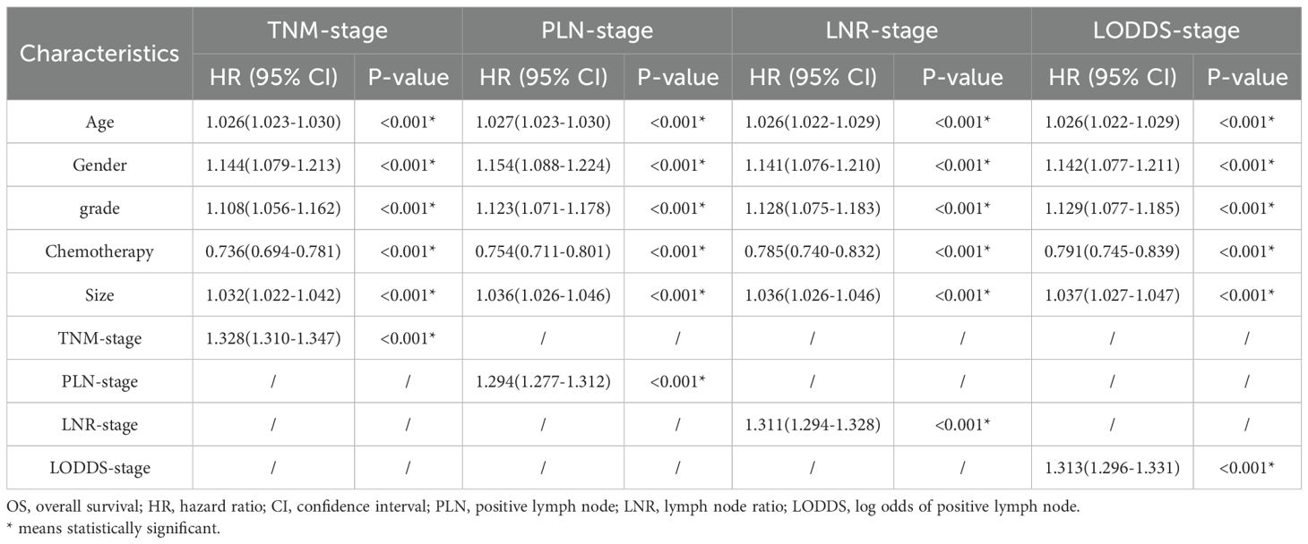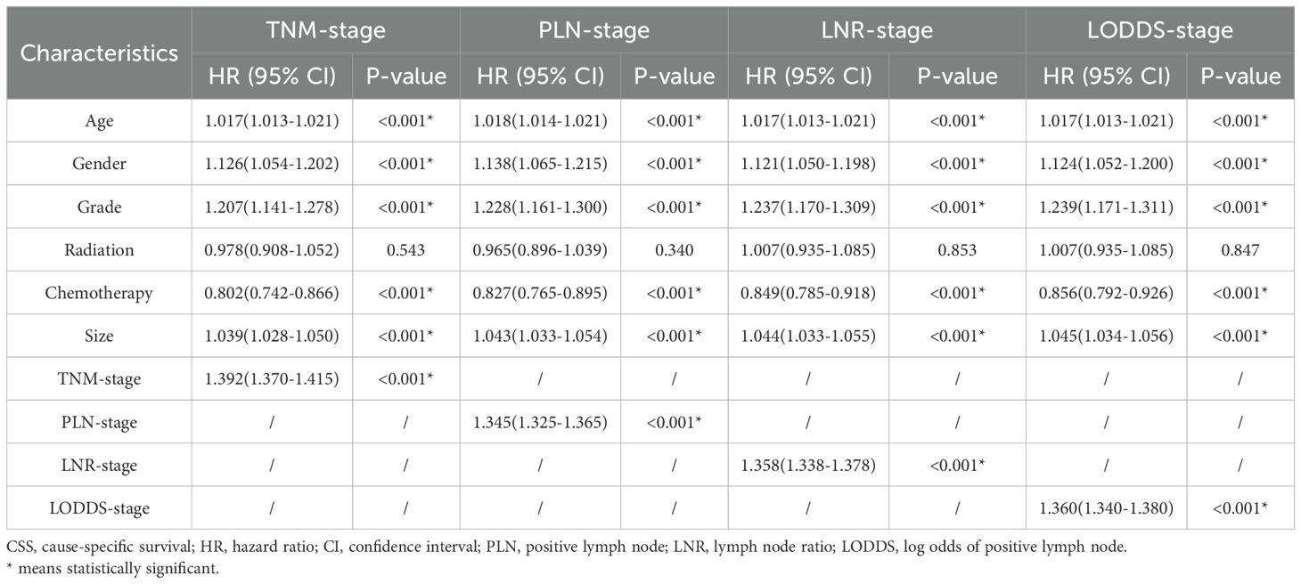 Firstly, 18 clinicopathologic variables were included in a univariate COX regression analysis, 16 of which were significantly associated with OS and 17 with CSS (Table 2). Subsequently, to address potential multicollinearity, certain variables were consolidated. In the analysis of OS, age, gender, grade, size and chemotherapy were included in the multivariate COX regression analysis in combination with one of TNM-stage, LNR-stage, PLN-stage and LODDS-stage, respectively. In the analysis of CSS, age, gender, grade, size, radiation and chemotherapy were included in the multifactorial COX regression analysis in combination with one of TNM-stage, LNR-stage, PLN-stage and LODDS-stage, respectively. The results showed that all included variables were identified as independent prognostic factors for OS (Table 3), and all but radiation were independent factors for CSS (Table 4). In conclusion, it’s consistent on both OS and CSS that age, gender, grade, size and chemotherapy in combination with one of TNM-stage, LNR-stage, PLN-stage and LODDS-stage were independent influence factors.