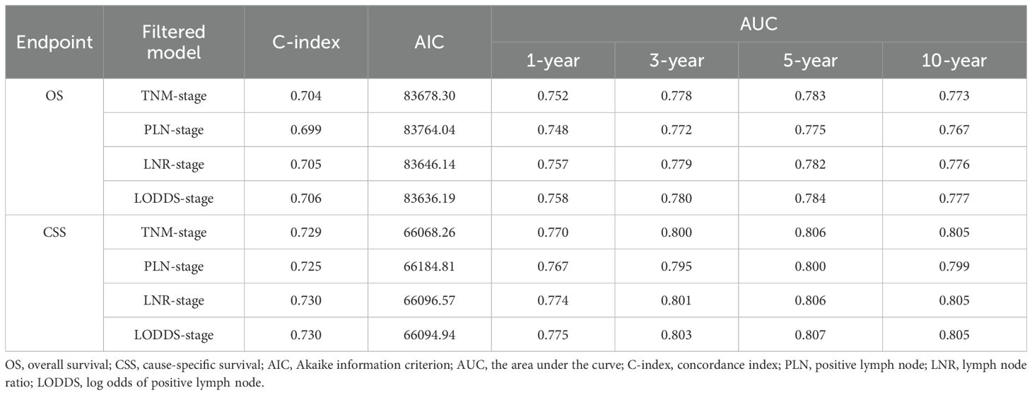 AIC, C-index, and AUC were used to compare the performance of the four staging-based prognostic prediction models in the training group. In the analysis of OS, LODDS-stage model demonstrated the lowest AIC value, the highest C-index and time-dependent AUC values at 1, 3, 5, and 10 years in comparison with the other three models. In the analysis of CSS, LODDS-stage model outperformed the other three staging systems in terms of C-index and time-dependent AUC across all evaluated time points (Table 5), indicating superior overall predictive performance.