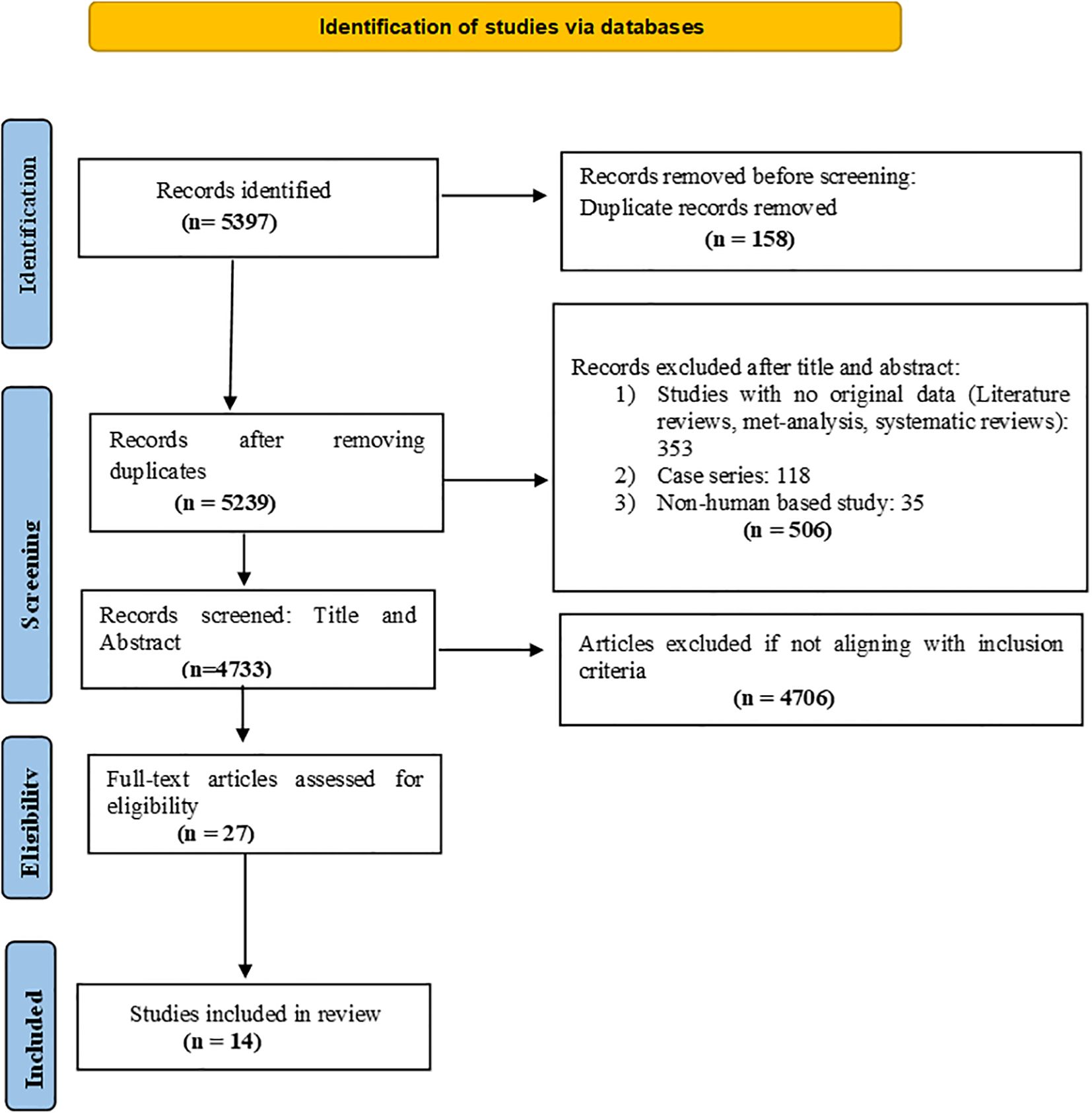 A rigorous selection process was followed in accordance with PRISMA guidelines. Initially, 5,397 records were identified through database searches. After removing 158 duplicates, 5,239 unique records were screened for relevance. During the title and abstract screening phase, 506 records were excluded for the following reasons: lack of original data (e.g., literature reviews, meta-analyses, systematic reviews), case series, animal-based studies, or surveys. Studies that did not report VTE occurrence stratified by cancer type or stage, or those in which VTE was not the primary outcome in cancer patients, were also excluded at this stage. This resulted in 4,733 records being considered for further evaluation. Subsequently, 4,706 records were excluded for not meeting the inclusion criteria. The remaining 27 full-text articles were assessed for eligibility. Of these, 13 were excluded after full-text review, resulting in 14 studies that fulfilled all inclusion criteria and were included in the final review. We included observational studies that reported the incidence or proportion of VTE in cancer patients, provided the data were stratified by cancer type or stage. Cross-sectional studies were excluded only if they did not specifically investigate cancer-associated VTE or failed to present stratified data relevant to our research objective. To minimize ambiguity, studies were not excluded solely based on their use of the term “prevalence” to describe VTE outcomes.