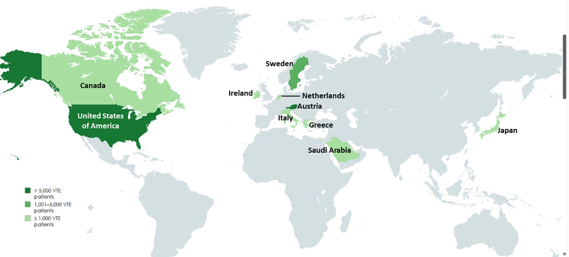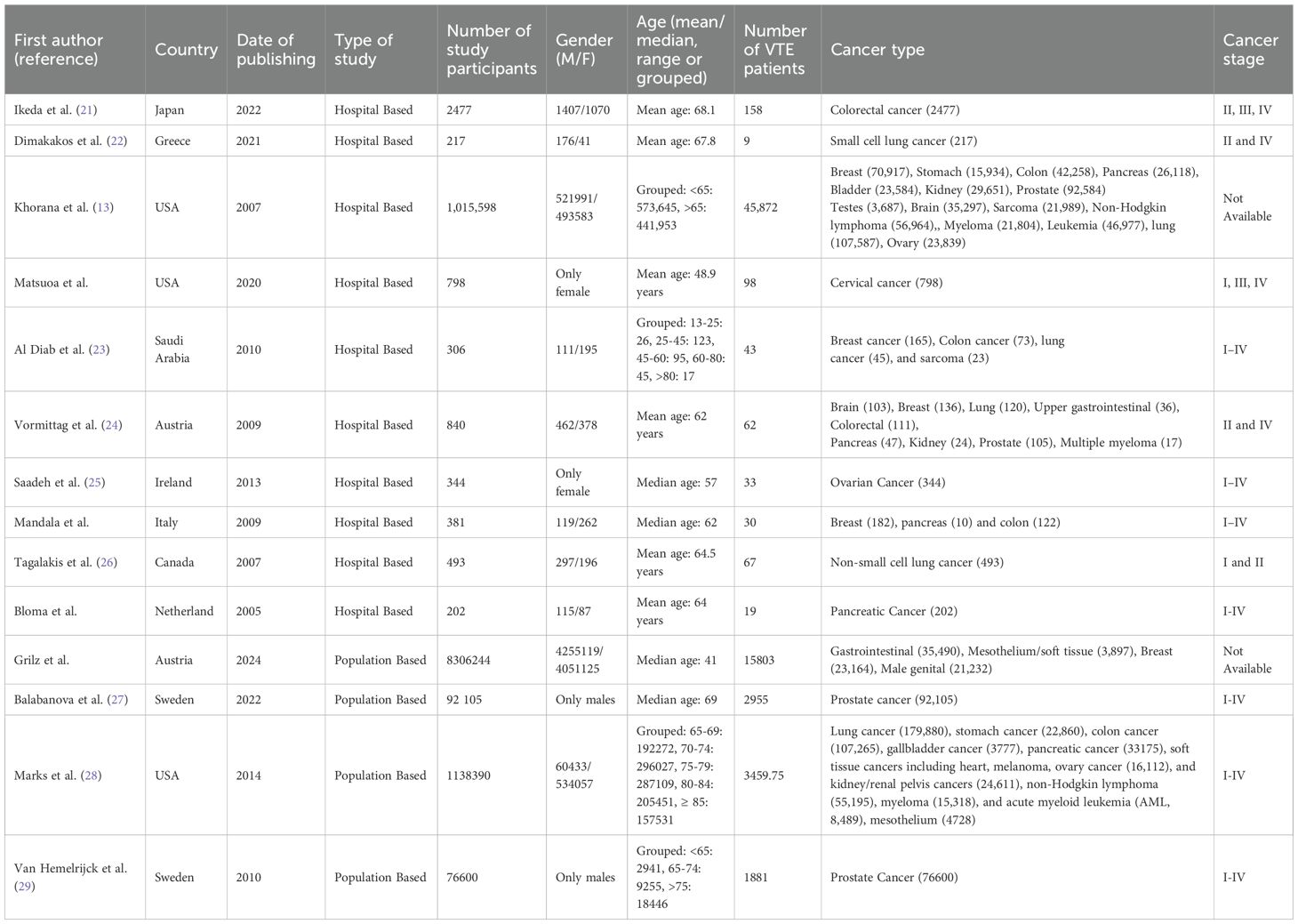The 14 studies included in this systematic review span multiple continents and employ various study designs to examine venous thromboembolism (VTE) in cancer patients. A summary of the included studies is presented in Table 1. These studies were conducted in a diverse range of countries, including Japan (21), Austria (31), Greece (22), the United States (6, 24), Saudi Arabia (23), Sweden (27, 29), Ireland (25), Canada (26), Italy (32), and the Netherlands (33), thereby contributing to a globally representative dataset. The geographical distribution of these studies is illustrated in Figure 2, where the grading reflects the number of studies reported per country, based on the number of VTE cases.