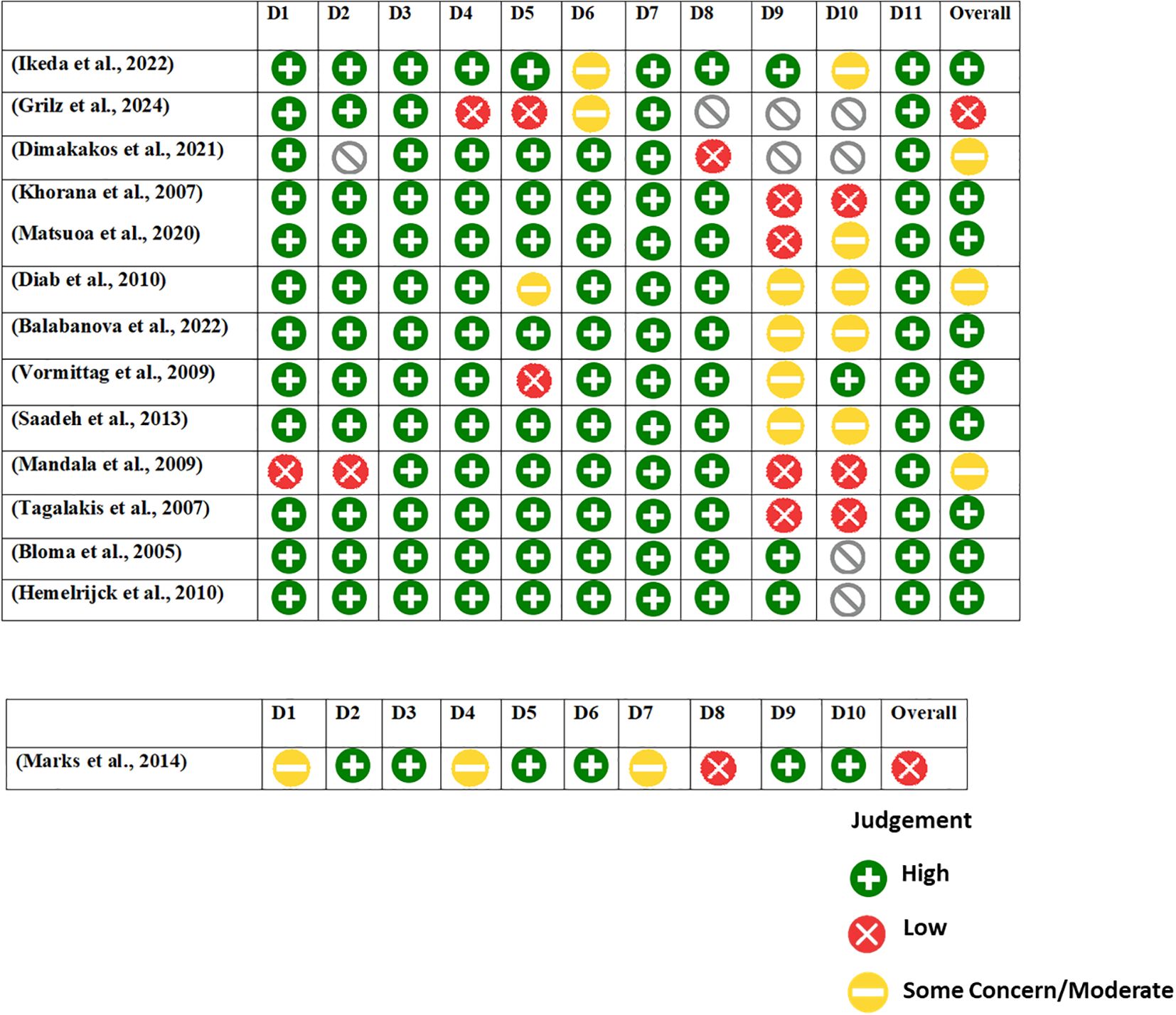 The risk of bias assessment for the case-control study by Marks et al. (2014), based on the JBI checklist, reveals moderate risk. The study performed well in consistent exposure measurement (D3, D5), identification of confounding factors (D6), and use of appropriate statistical analysis (D10). However, concerns arise due to unclear group comparability (D1), exposure assessment (D4), and strategies for managing confounding (D7). Notably, outcome assessment (D8) was inadequate (“No”). These limitations suggest potential bias, warranting cautious interpretation of the findings (Figure 3).