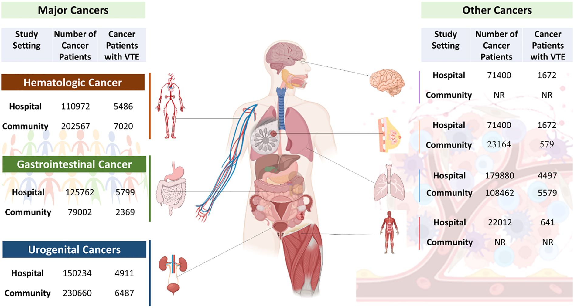 Figure 4. Schematic representation of various cancer types and their association with VTE development. (Created in Biorender.com).