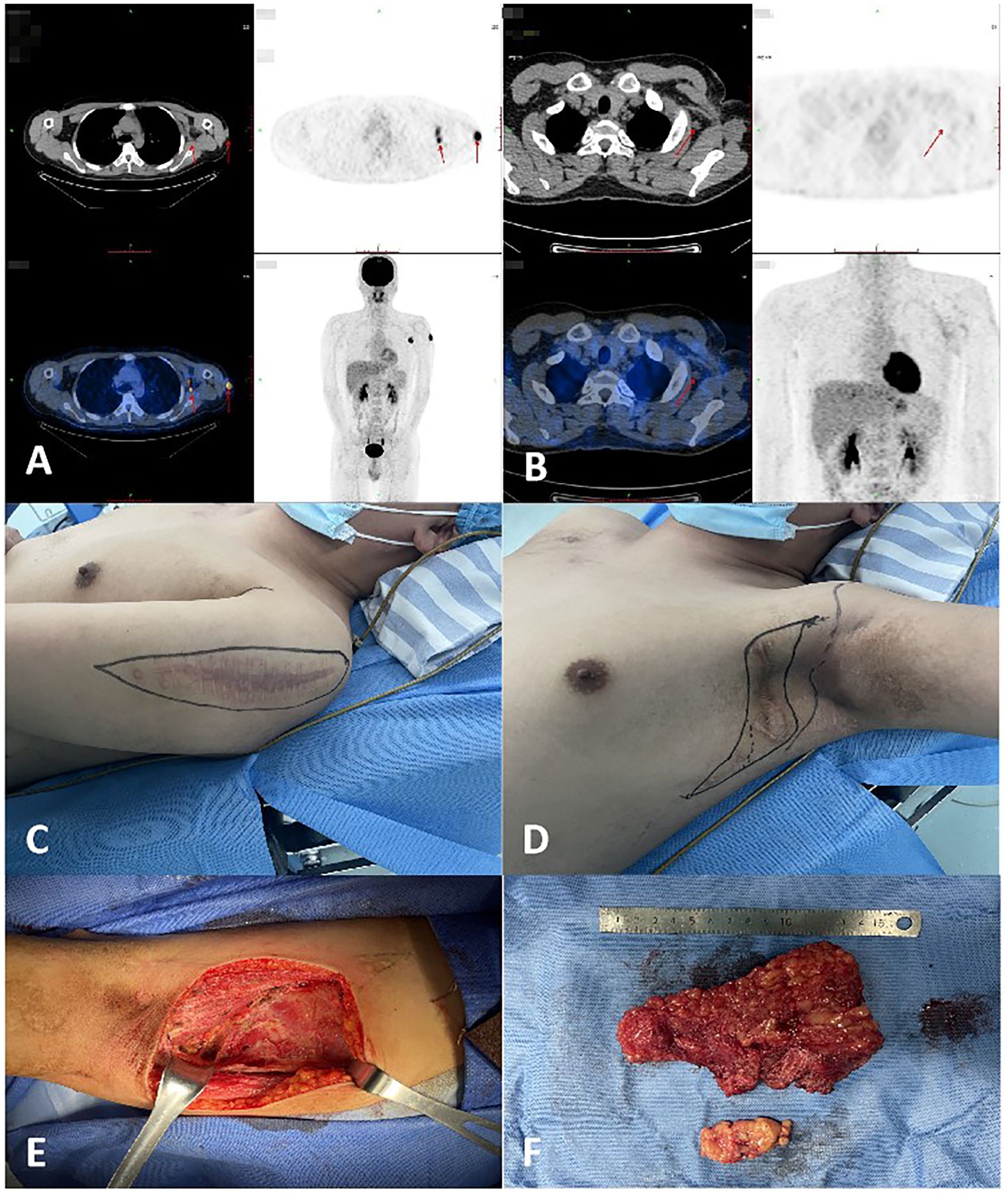 Figure 1. (A) The patient’s PET-CT results indicated lymph node metastasis in the left axilla in January 2023. (B) The patient’s PET-CT results revealed left axillary lymph node metastases in April 2023. (C) Preoperative photograph of the recurrent tumor mass in the patient’s left upper arm awaiting excision. (D) Preoperative photograph of the metastatic lymph nodes in the patient’s left axilla awaiting dissection. (E) Intraoperative photos of the patient. (F) Photos of the removed mass.