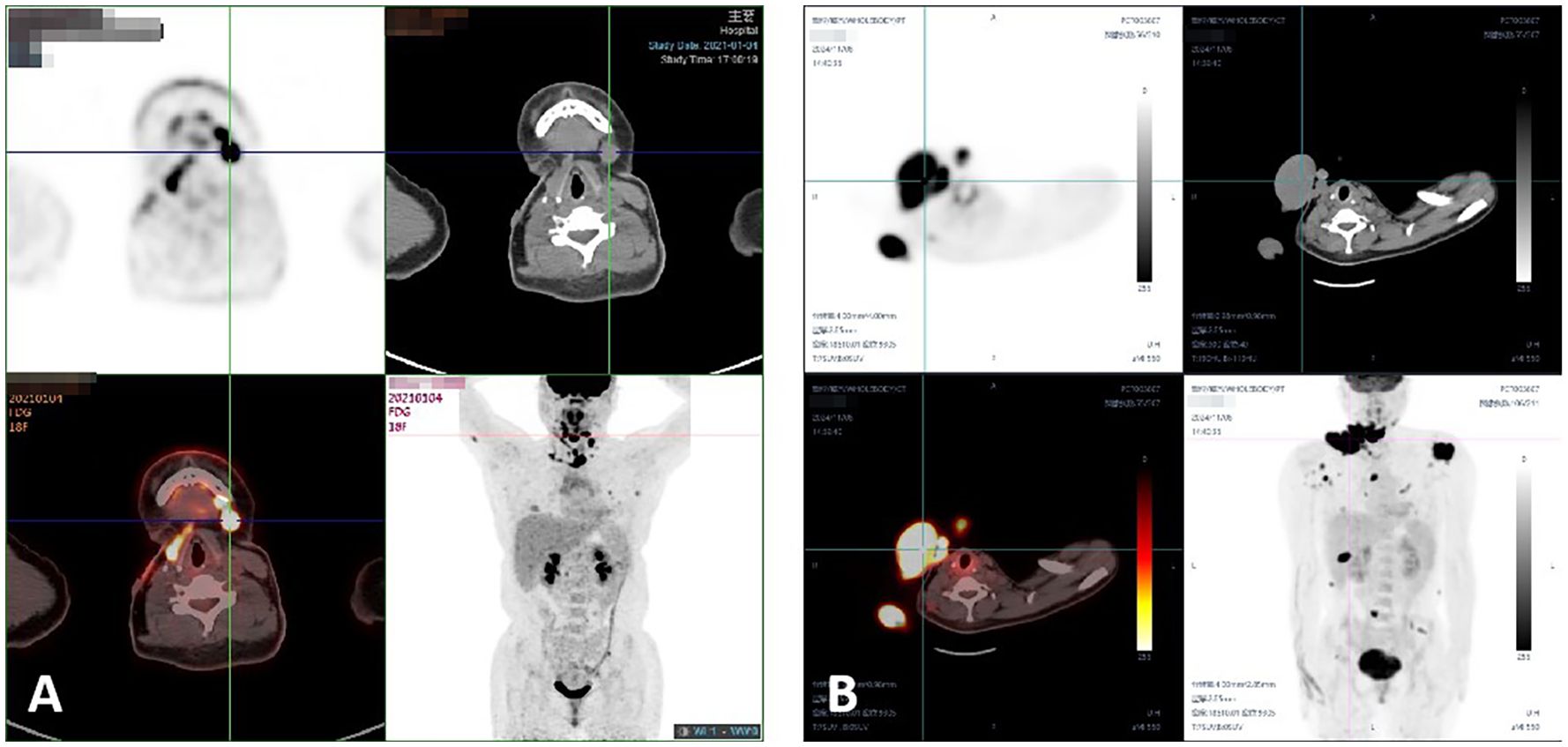 Figure 2. (A) The patient’s PET-CT results indicated multiple subcutaneous metastases in January 2021. (B) The patient’s PET-CT results revealed multiple subcutaneous and lung metastases in November 2024.