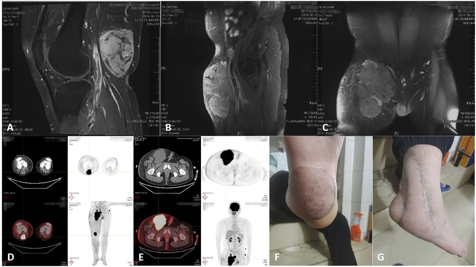 Figure 3. (A-C) MRI revealed a right groin mass in August 2024. (D) The patient’s PET-CT results indicated lymph nodes metastasis in the right popliteal fossa in September 2024. (E) The patient’s PET-CT results revealed subcutaneous metastasis in left pelvic wall in September 2024. (F, G) Photograph of the right foot mass at the time of the patient’s visit in November 2024.