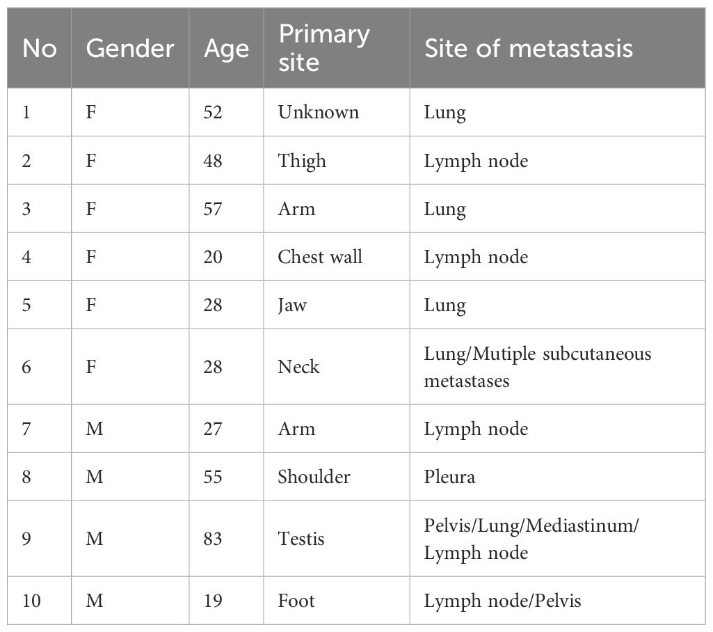 Among the ten cases reviewed, three were classified as cellular variants, and one as a hemangioma variant. The primary tumor sites included two cases in the head and neck, four in the limbs, one in the chest wall, one in the shoulder, one in the testis, and one with an unknown origin. Metastatic patterns included five cases with pulmonary metastases, five with lymph node metastases, two with subcutaneous metastases, and one with pleural metastasis (Table 1).