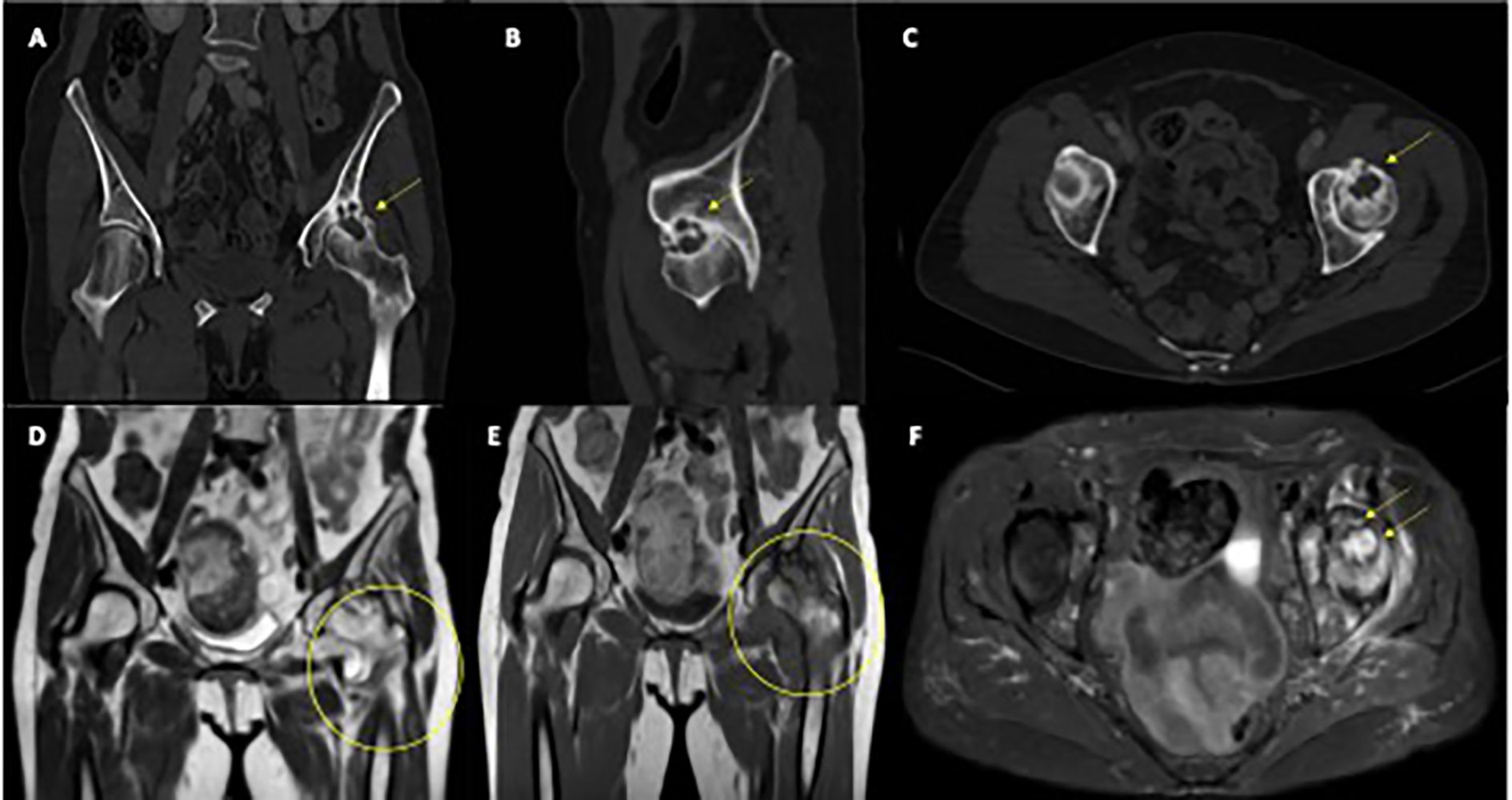 Figure 1. Radiological features of left femoral head osteitis during immunotherapy. (A–C) CT scans show progressive deformation and sclerosis of the left femoral head (yellow arrows). (D, E) Coronal T1-weighted MRI images demonstrate diffuse bone marrow edema and joint effusion (yellow circles). (F) Axial T2-weighted MRI highlights extensive marrow edema and synovial hypertrophy (yellow arrows).