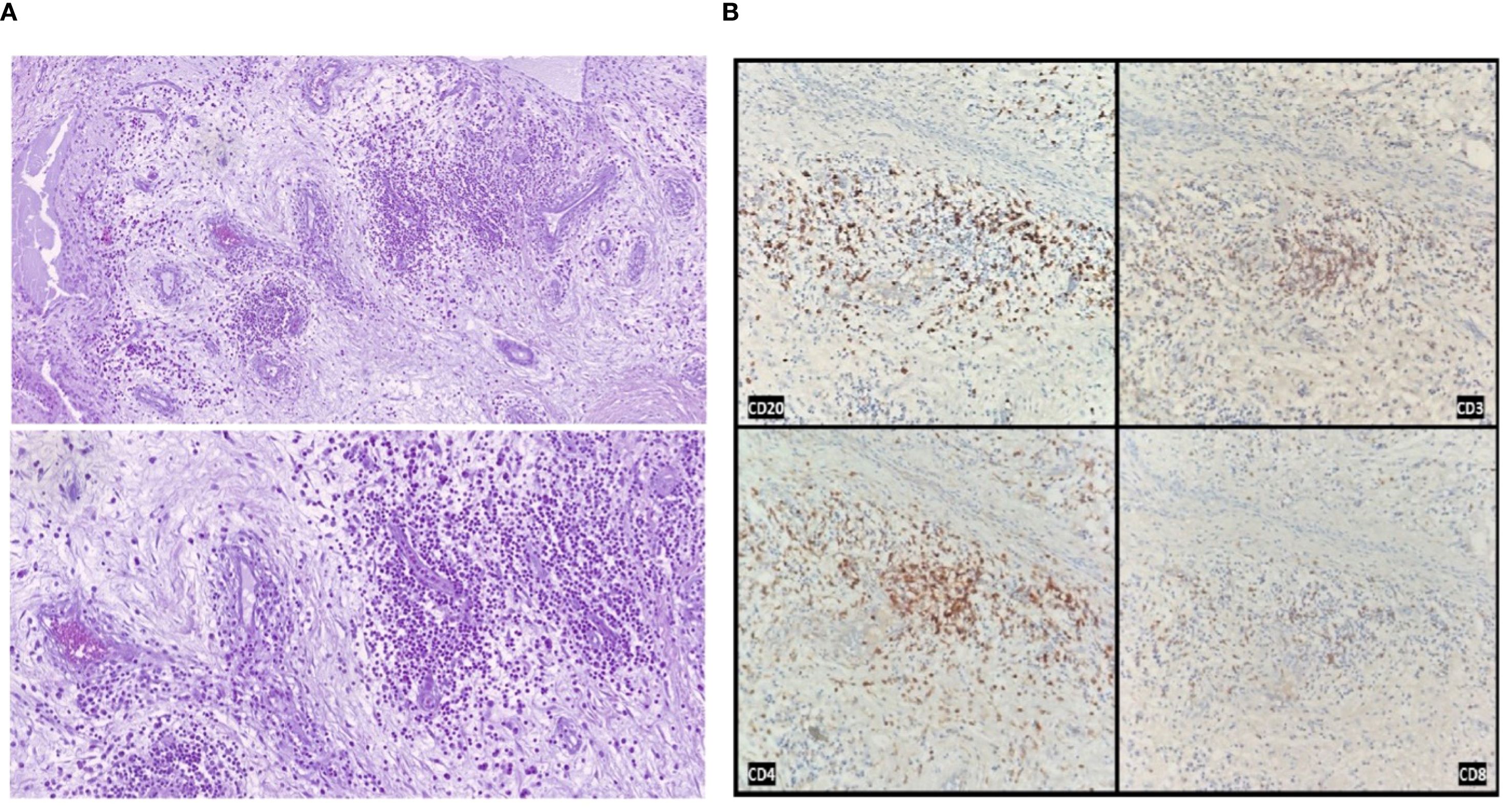 Figure 2. Histological and immunohistochemical analysis of the resected femoral head. (A) Hematoxylin and eosin staining showing areas of fibrosis with neoangiogenesis, vascular congestion, and dense lymphoplasmacytic inflammatory infiltrates, in the absence of bone necrosis (original magnification 100× and 200×). (B) Immunohistochemical staining demonstrating the immune infiltrate composition: CD20-positive B cells, CD3-positive T cells, with a predominance of CD4-positive over CD8-positive T lymphocytes.