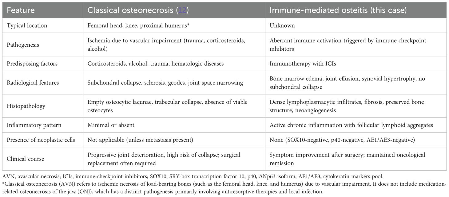 Classical AVN is characterized by ischemic bone infarction, leading to trabecular collapse, empty osteocytic lacunae, and eventual joint destruction, typically without significant inflammatory infiltration. In contrast, immune-mediated osteitis presents with preserved bone structure, dense lymphoplasmacytic infiltrates, neoangiogenesis, and active chronic inflammation without evidence of bone necrosis. These fundamental differences, summarized in Table 1, support the interpretation of this event as a novel skeletal irAE distinct from both classical AVN and medication-related osteonecrosis of the jaw (ONJ). In selected cases, 99mTc-methylene diphosphonate (MDP) bone scintigraphy may provide additional diagnostic information. In fact, early AVN often presents as a photopenic (“cold”) lesion due to impaired blood supply, whereas immune-mediated osteitis is expected to show increased radiotracer uptake reflecting enhanced bone turnover. Although not performed in our patient, this modality could be considered when MRI findings are inconclusive, and its absence represents a limitation of our report.